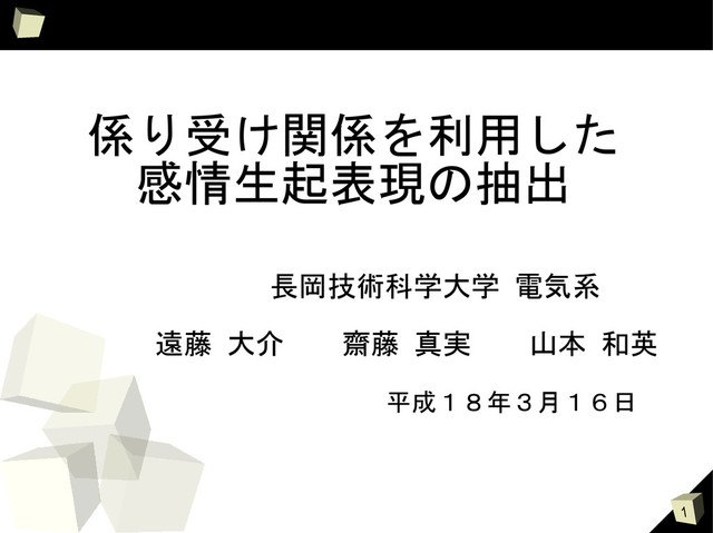 1 係り受け関係を利用した 感情生起表現の抽出 長岡技術科学大学 電気系 遠藤 大介 齋藤 真実 山本 和英 平成18年3月16日