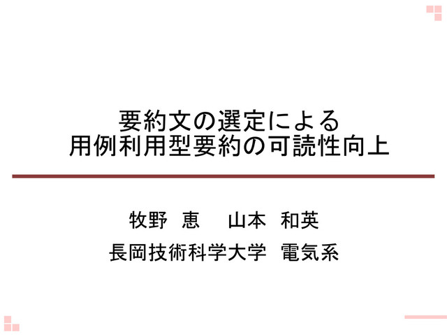C D E。 F G H I J K L。 M N O P。 要約事例DB 入力ニュース記事 。 。 … a b c d e。 A D E I P J N O B E L H E 対応文節 a b c d e。 A D E I P J N O B E L H E 出力要約文 J D O B P。 1. 類似用例文の獲得 要約事例DBから 入力の内容に類似した 用例文を探す 2.文節の 対応付け 類似用例文の 文節に類似した入力の 文節を対応付ける 3.対応文節の 組合せ 全体で最もスコアの 高くなるパスを 見つける 類似用例文 1文 a b c d e 。