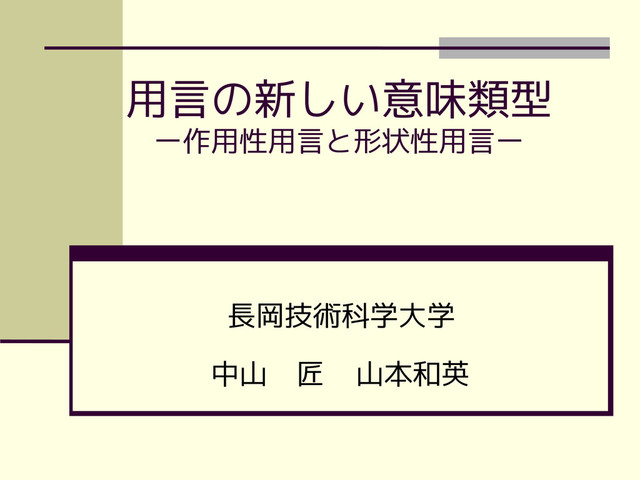 中山 匠, 山本 和英. 用言の新しい意味類型ー作用性用言と形状性用言ー. 言語処理学会第17回年次大会, pp.560-563 (2011.3)