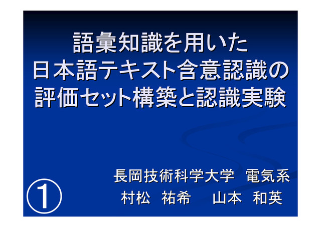 日本語テキスト含意認識の 日本語テキスト含意認識の 日本語テキスト含意認識の 日本語テキスト含意認識の 日本語テキスト含意認識の 日本語テキスト含意認識の 評価セット構築と認識実験 評価セット構築と認識実験 評価セット構築と認識実験 評価セット構築と認識実験 評価セット構築と認識実験 評価セット構築と認識実験 評価セット構築と認識実験 評価セット構築と認識実験 長岡技術科学大学 長岡技術科学大学 電気系 電気系 村松 村松 祐希 祐希 山本 山本 和英 和英 ①