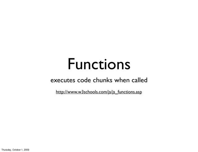 fullName(first_name, last_name) { return first_name + ' ' + last_name; } var wes = fullName('Wes', 'Mantooth'); // wes variable is now 'Wes Mantooth' var brian = fullName('Brian', 'Fantana'); // brian variable is now 'Brian Fantana' Thursday, October 1, 2009