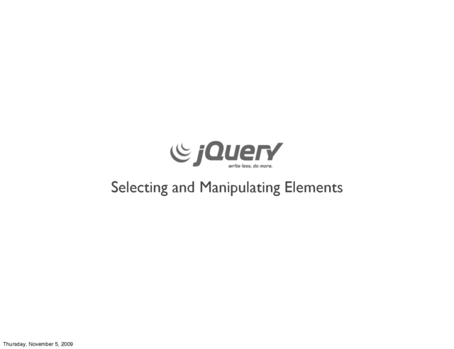 This document discusses selecting and manipulating elements with jQuery. It explains that jQuery simplifies HTML document traversing, event handling, animating, and Ajax interactions. It then discusses selecting elements by ID, class, tag name, or CSS selector. It also covers looping through elements and common jQuery methods like html(), css(), and attr() for manipulating element content, styles, and attributes.