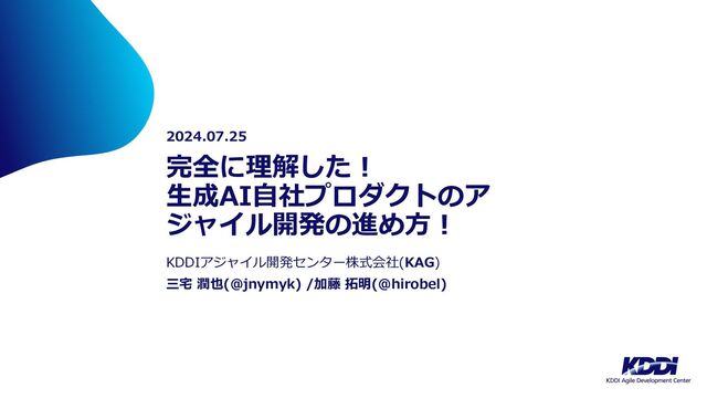 完全に理解した︕ ⽣成AI⾃社プロダクトのア ジャイル開発の進め⽅︕ 2024.07.25 KDDIアジャイル開発センター株式会社(KAG) 三宅 潤也(@jnymyk) /加藤 拓明(@hirobel)