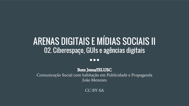 Material das aulas de Arenas Digitais II do curso superior de Comunicação Social - Publicidade e Propaganda do Bom Jesus/IELUSC. Definições gerais sobre o ciberespaço como um simulacro do espaço. Relações do tempo e espaço na comunicação online. Rápido histórico sobre interfaces gráficas do usuário. Apresentação das ofertas comuns de mercado em agências digitais.
