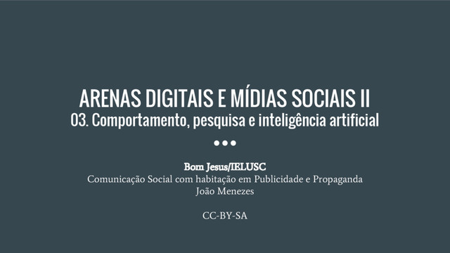 Material das aulas de Arenas Digitais II do curso superior de Comunicação Social - Publicidade e Propaganda do Bom Jesus/IELUSC. Apresentação de estatísticas sobre o uso de dispositivos digitais no Brasil. Visão geral dos conceitos de cognição e subjetividade. Estudo paralelo sobre Teste de Turing, algoritmos e a limitação da obtenção de audiência nas mídias digitais por conta dos cálculos matemáticos automatizados. Estilização da inteligência artificial sob o olhar do cinema.