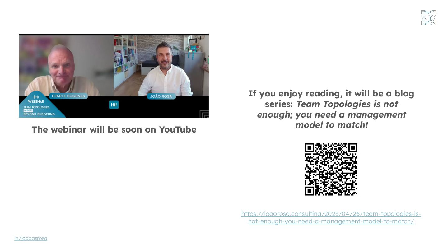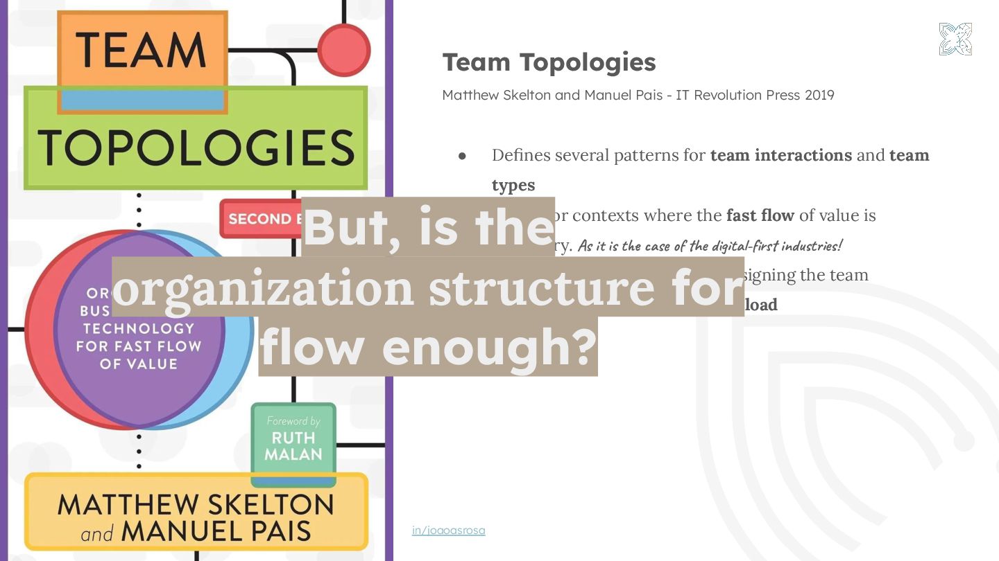 Team Topologies have crossed the chasm. Folks are using it, and as with any good approach based on patterns, they discover blockers to flow. They discuss those and try to improve. However, there is always some feeling that dark patterns pull away the evolution of teams and their interactions. The organization’s design and software architecture don’t achieve their potential.