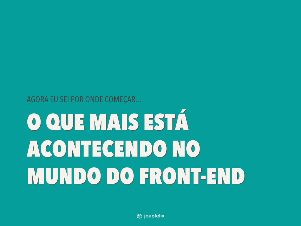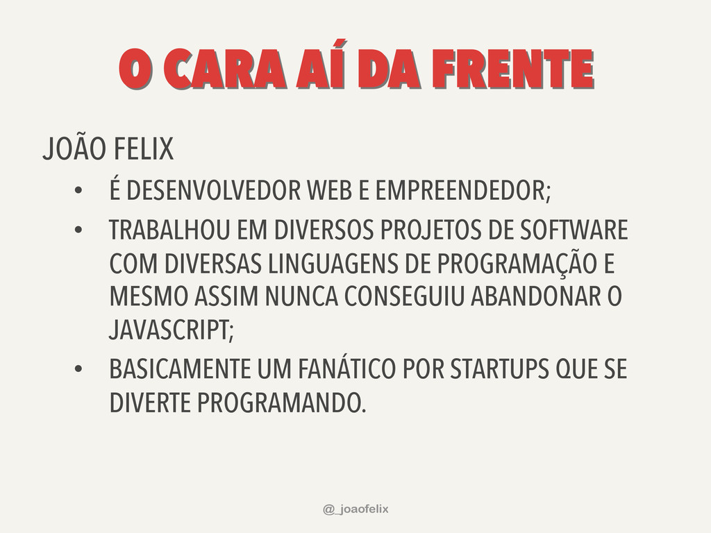 EM DIVERSOS PROJETOS DE SOFTWARE COM DIVERSAS LINGUAGENS DE PROGRAMAÇÃO E MESMO ASSIM NUNCA CONSEGUIU ABANDONAR O JAVASCRIPT; • BASICAMENTE UM FANÁTICO POR STARTUPS QUE SE DIVERTE PROGRAMANDO. @_joaofelix