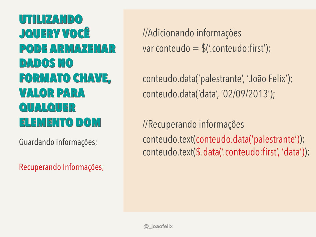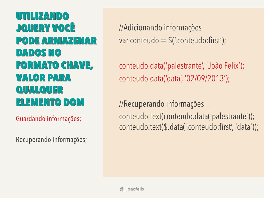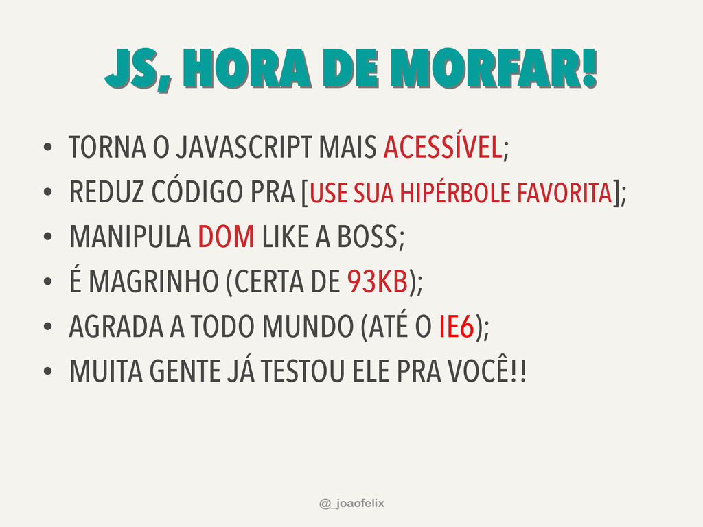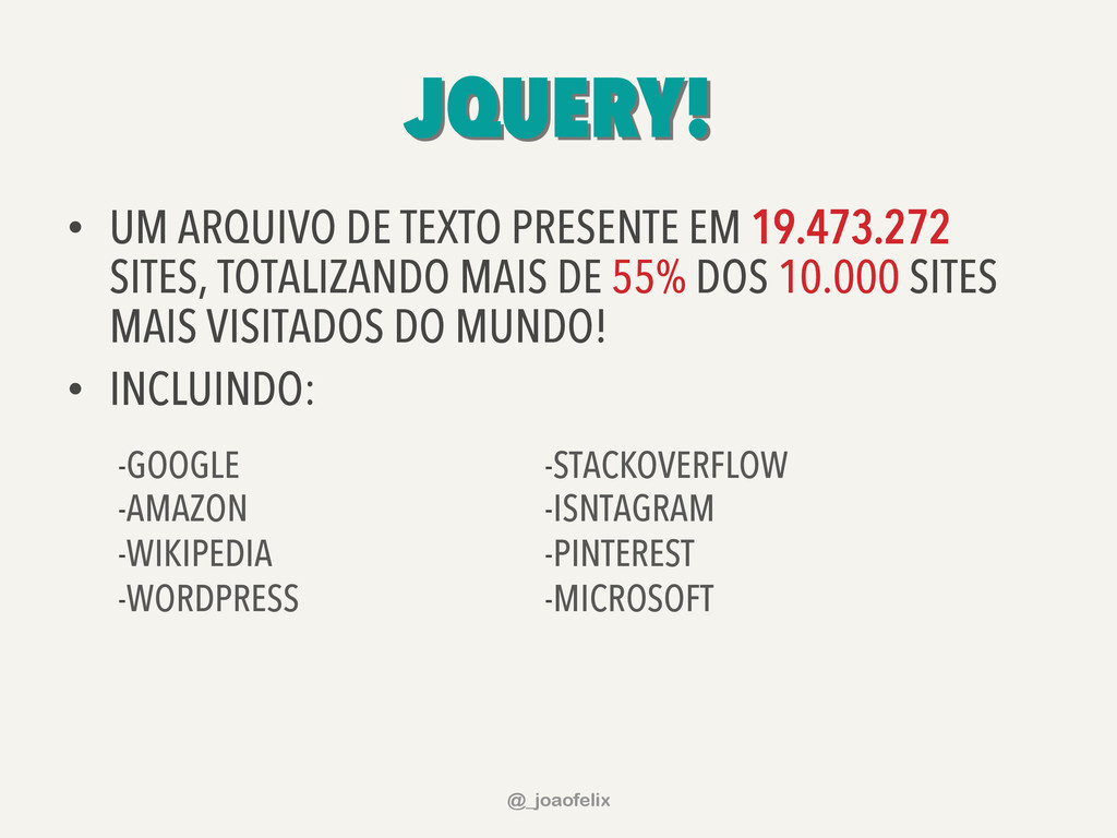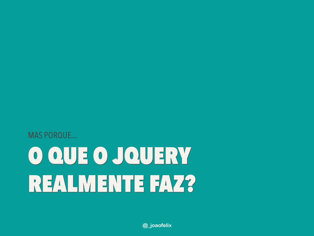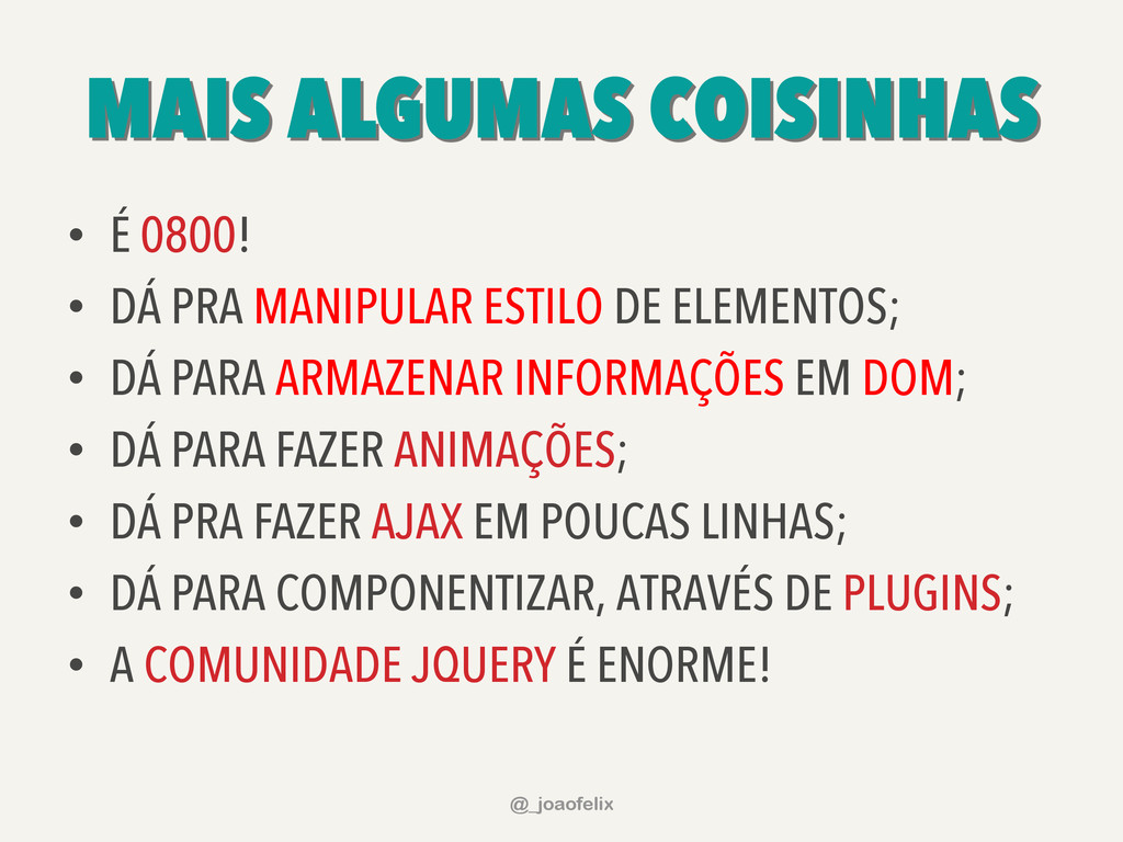 • DÁ PARA ARMAZENAR INFORMAÇÕES EM DOM; • DÁ PARA FAZER ANIMAÇÕES; • DÁ PRA FAZER AJAX EM POUCAS LINHAS; • DÁ PARA COMPONENTIZAR, ATRAVÉS DE PLUGINS; • A COMUNIDADE JQUERY É ENORME! @_joaofelix