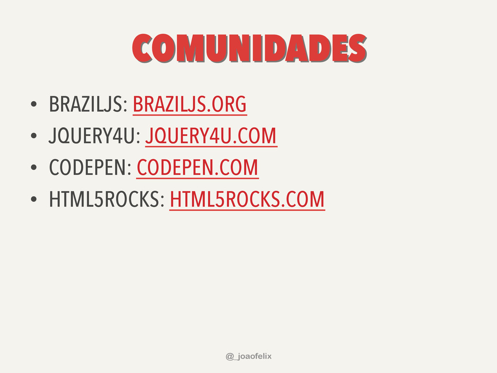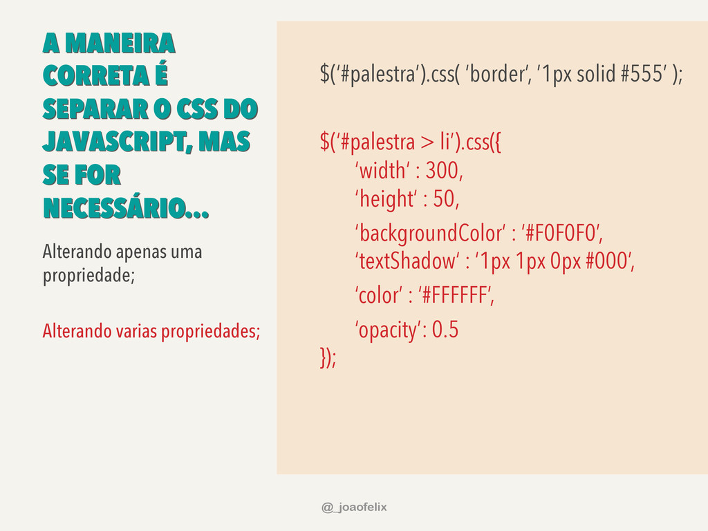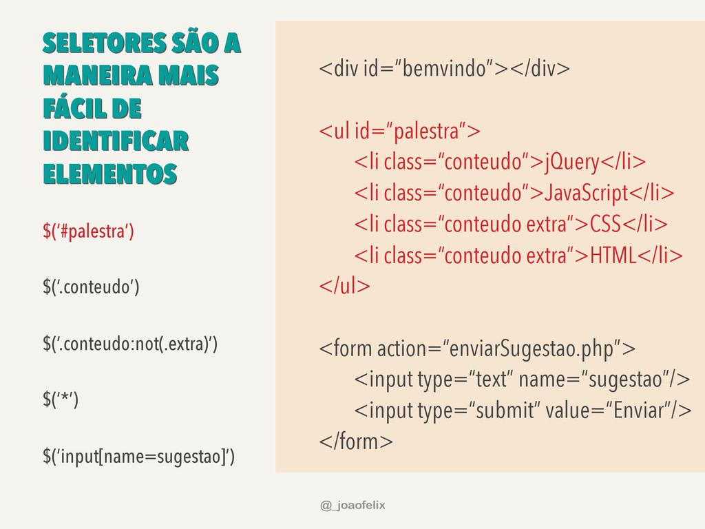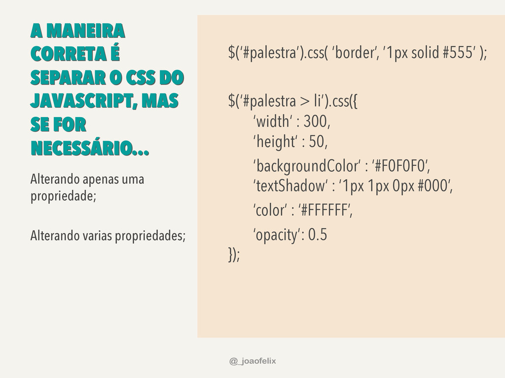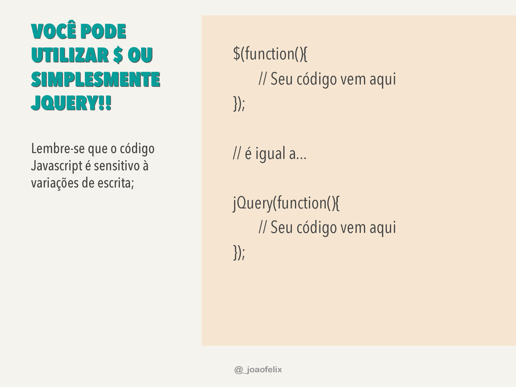 • DÁ PARA ARMAZENAR INFORMAÇÕES EM DOM; • DÁ PARA FAZER ANIMAÇÕES; • DÁ PRA FAZER AJAX EM POUCAS LINHAS; • DÁ PARA COMPONENTIZAR, ATRAVÉS DE PLUGINS; • A COMUNIDADE JQUERY É ENORME! @_joaofelix