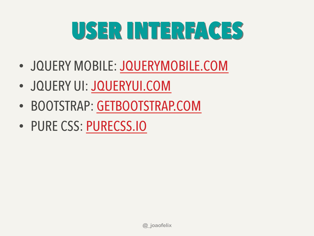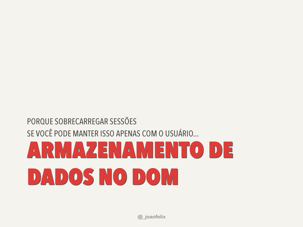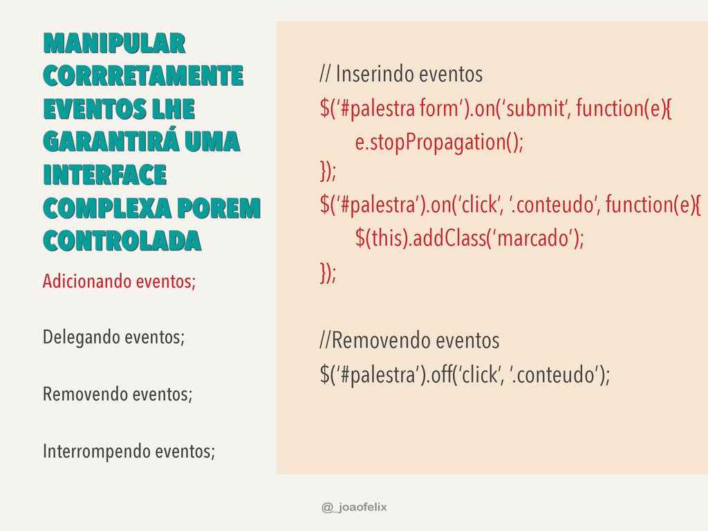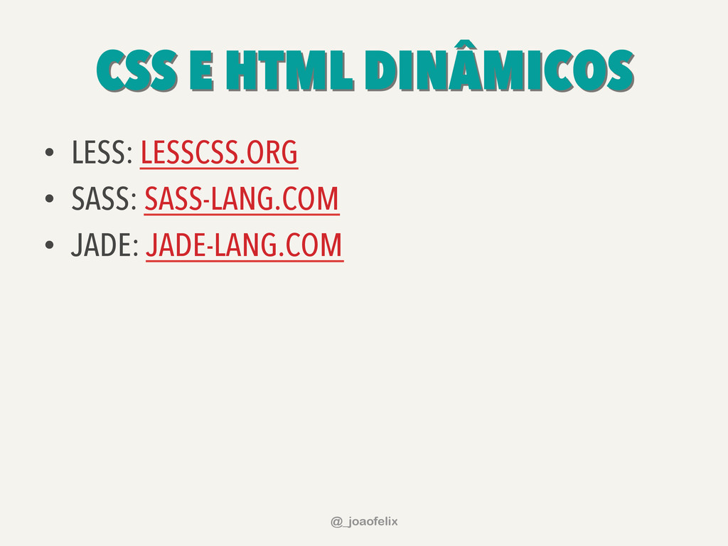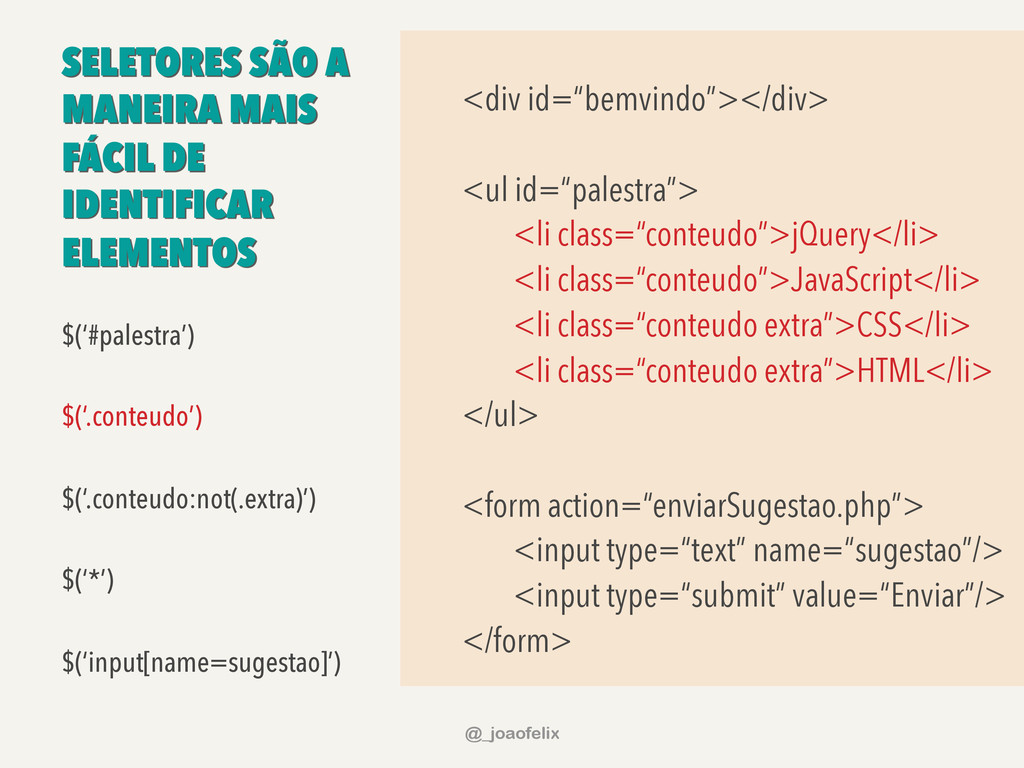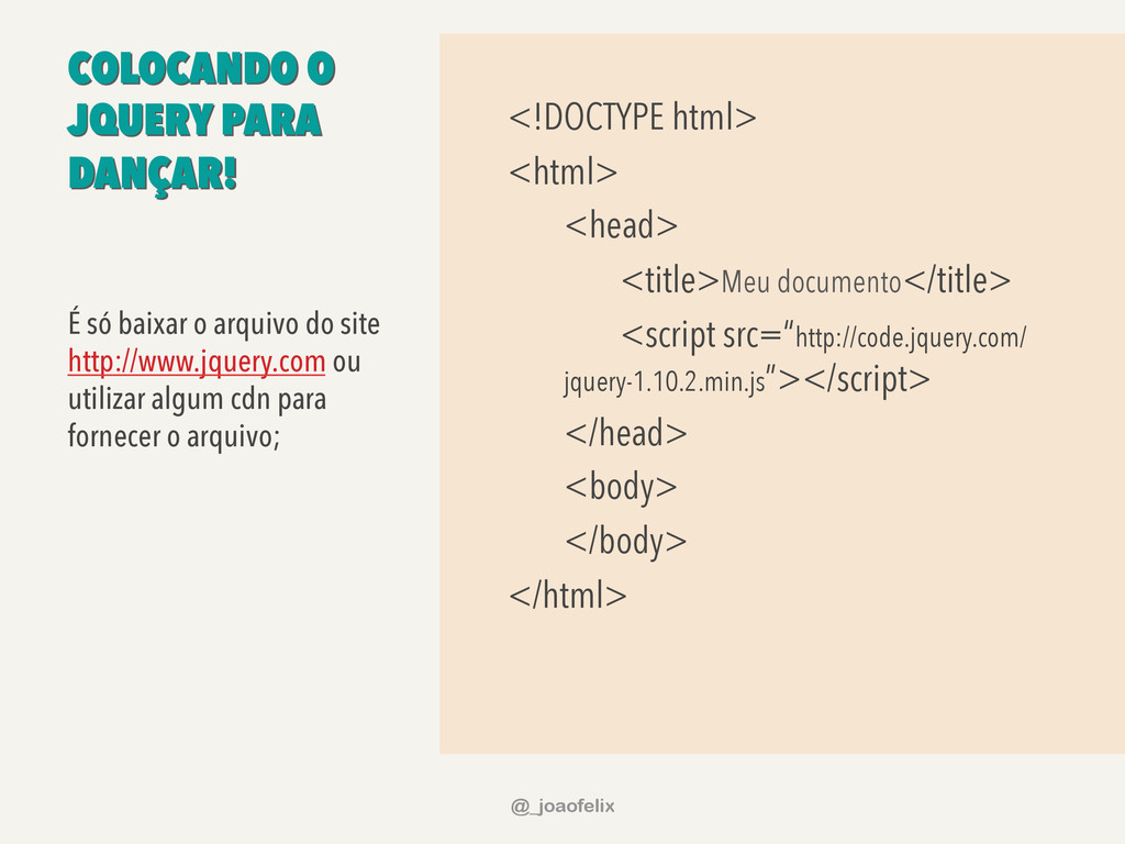 • DÁ PARA ARMAZENAR INFORMAÇÕES EM DOM; • DÁ PARA FAZER ANIMAÇÕES; • DÁ PRA FAZER AJAX EM POUCAS LINHAS; • DÁ PARA COMPONENTIZAR, ATRAVÉS DE PLUGINS; • A COMUNIDADE JQUERY É ENORME! @_joaofelix