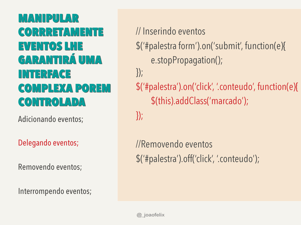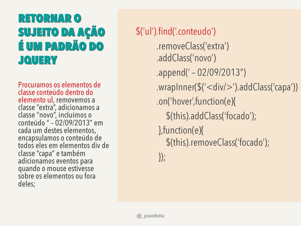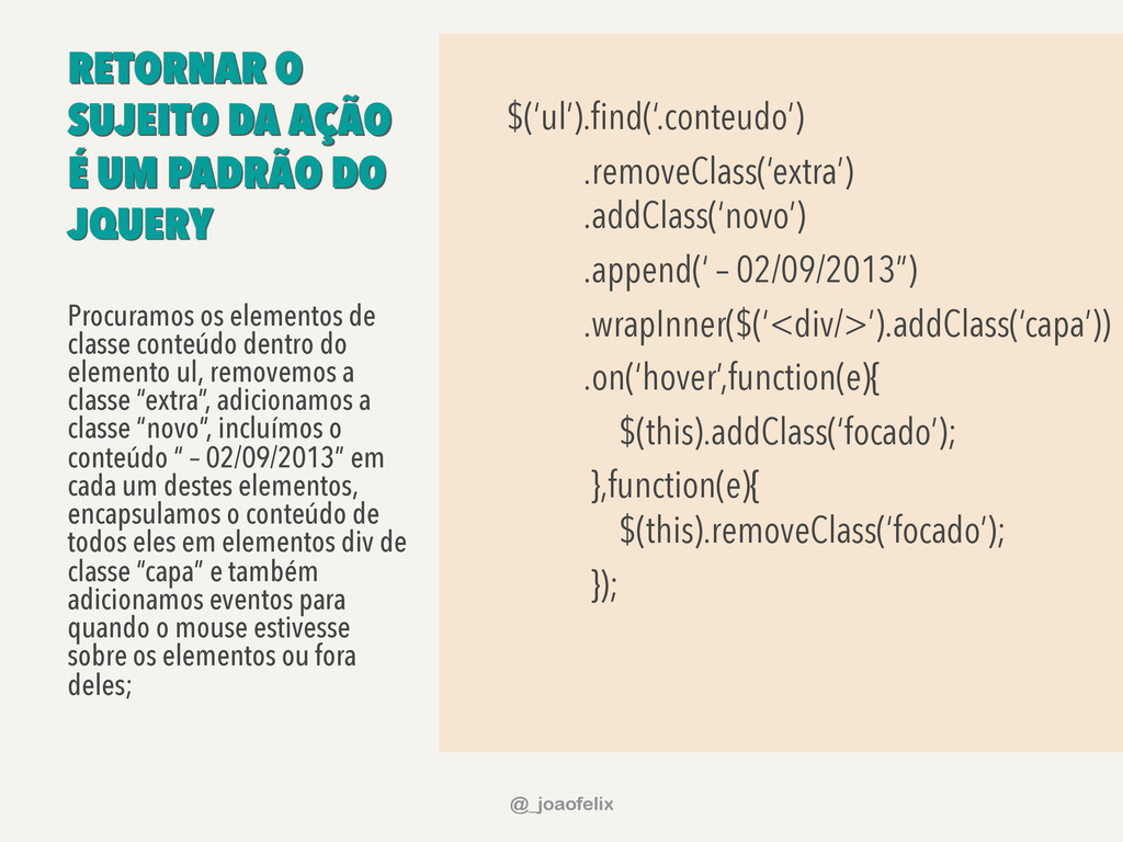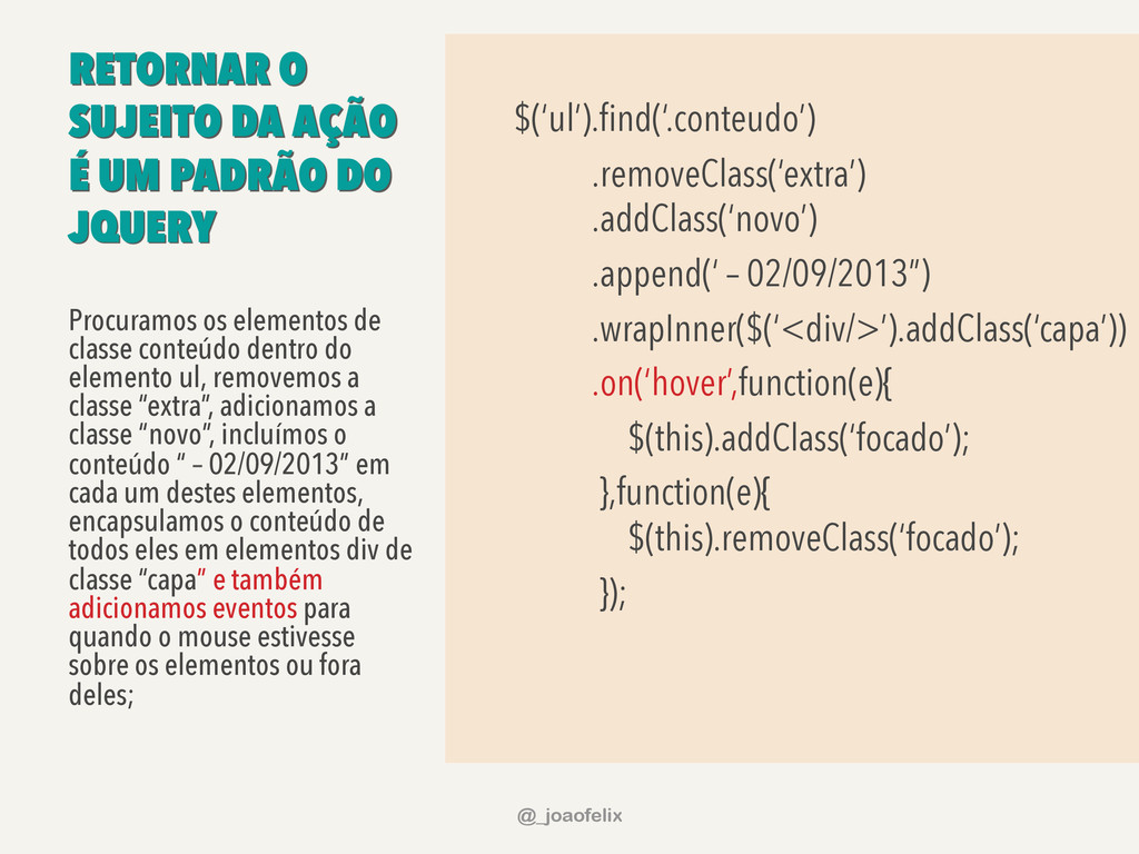 $(this).removeClass(‘focado’); }); Procuramos os elementos de classe conteúdo dentro do elemento ul, removemos a classe “extra”, adicionamos a classe “novo”, incluímos o conteúdo “ – 02/09/2013” em cada um destes elementos, encapsulamos o conteúdo de todos eles em elementos div de classe “capa” e também adicionamos eventos para quando o mouse estivesse sobre os elementos ou fora deles; @_joaofelix