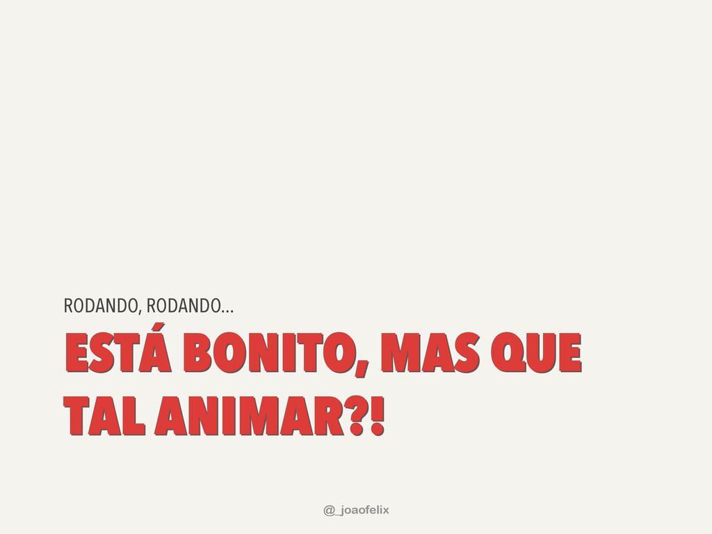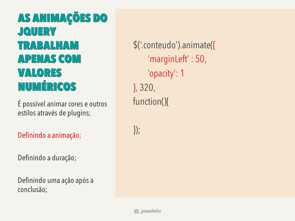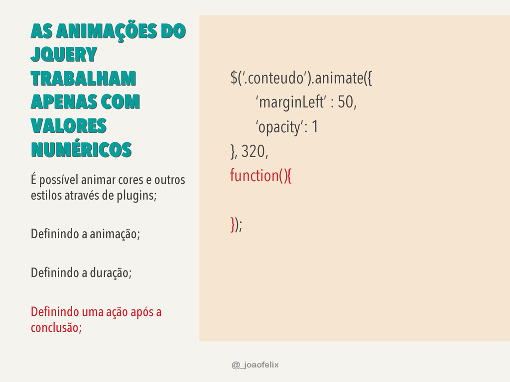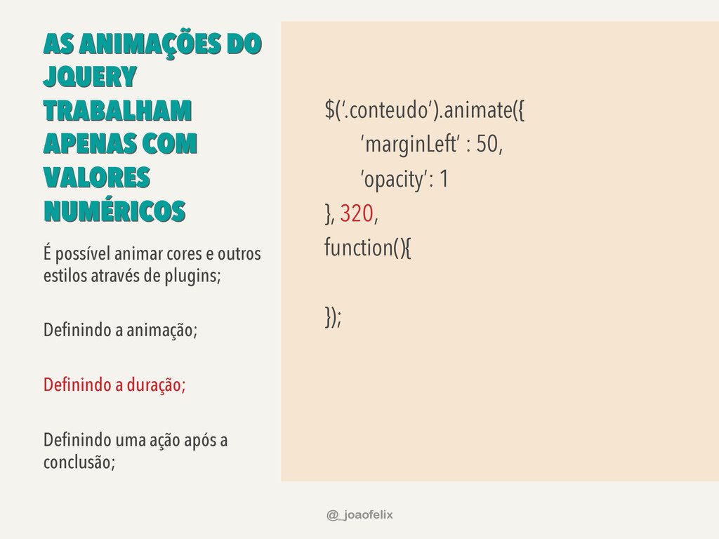 É possível animar cores e outros estilos através de plugins; Definindo a animação; Definindo a duração; Definindo uma ação após a conclusão; @_joaofelix