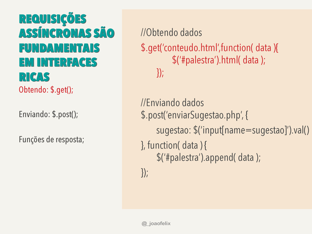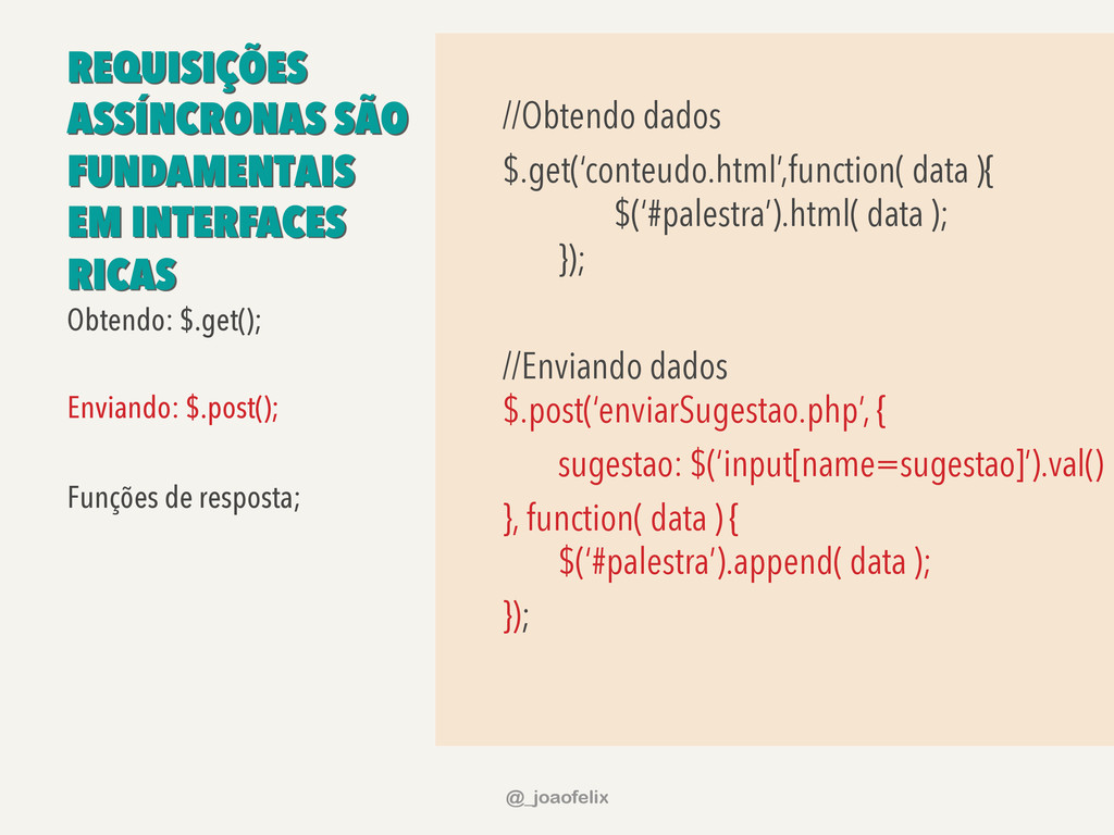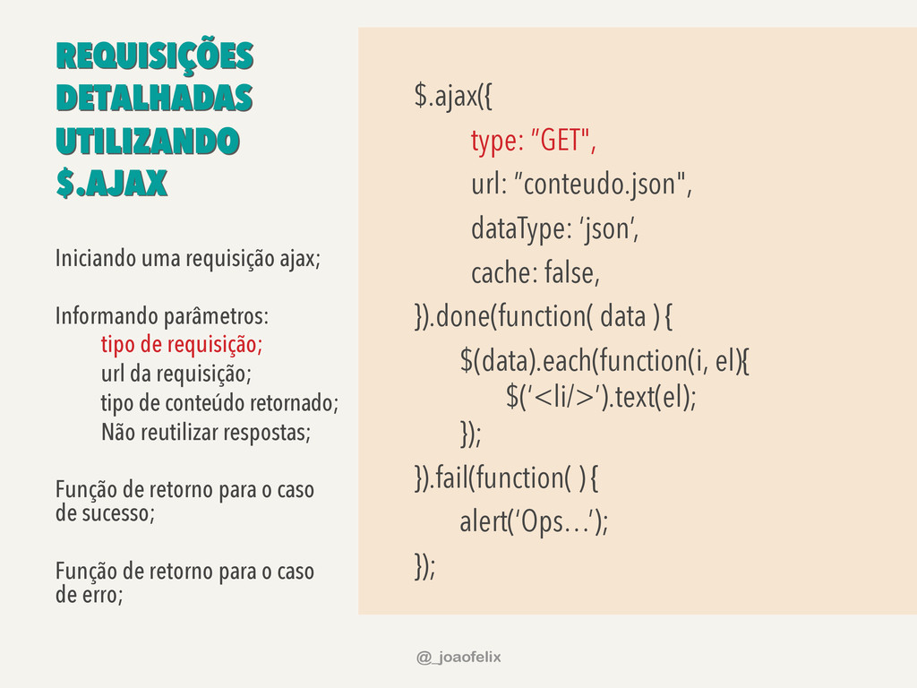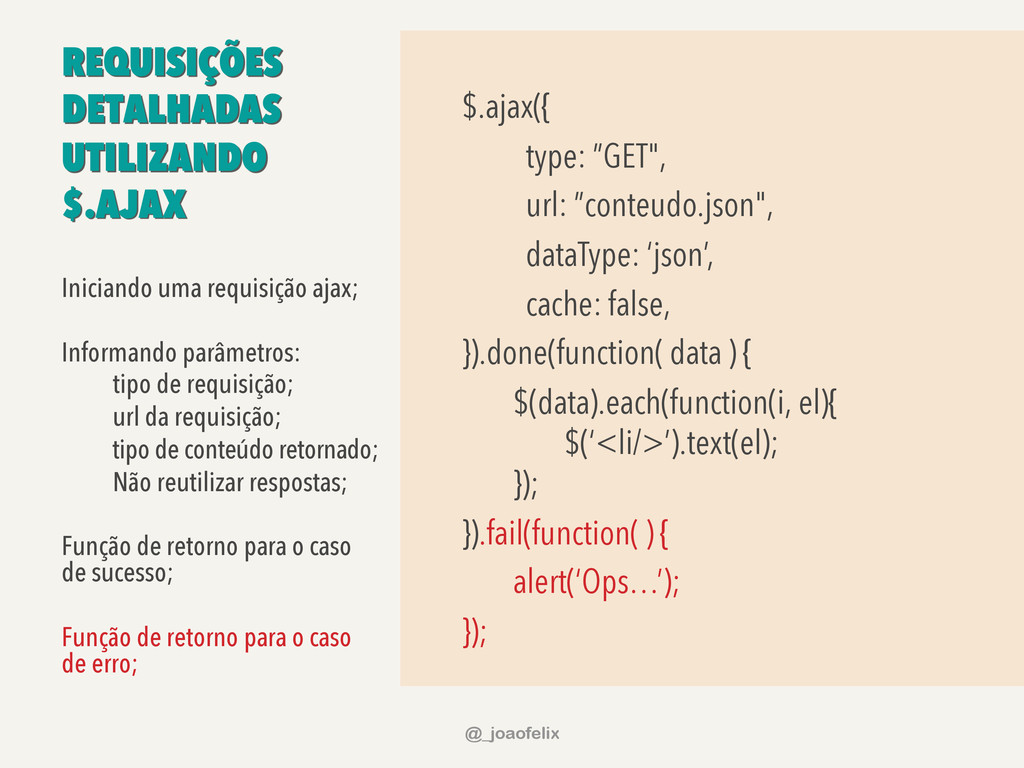 data ) { $(data).each(function(i, el){ $(‘<li/>’).text(el); }); }).fail(function( ) { alert(‘Ops…’); }); Iniciando uma requisição ajax; Informando parâmetros: tipo de requisição; url da requisição; tipo de conteúdo retornado; Não reutilizar respostas; Função de retorno para o caso de sucesso; Função de retorno para o caso de erro; @_joaofelix