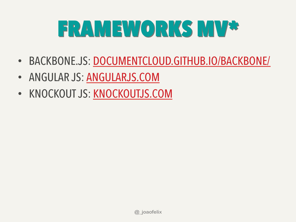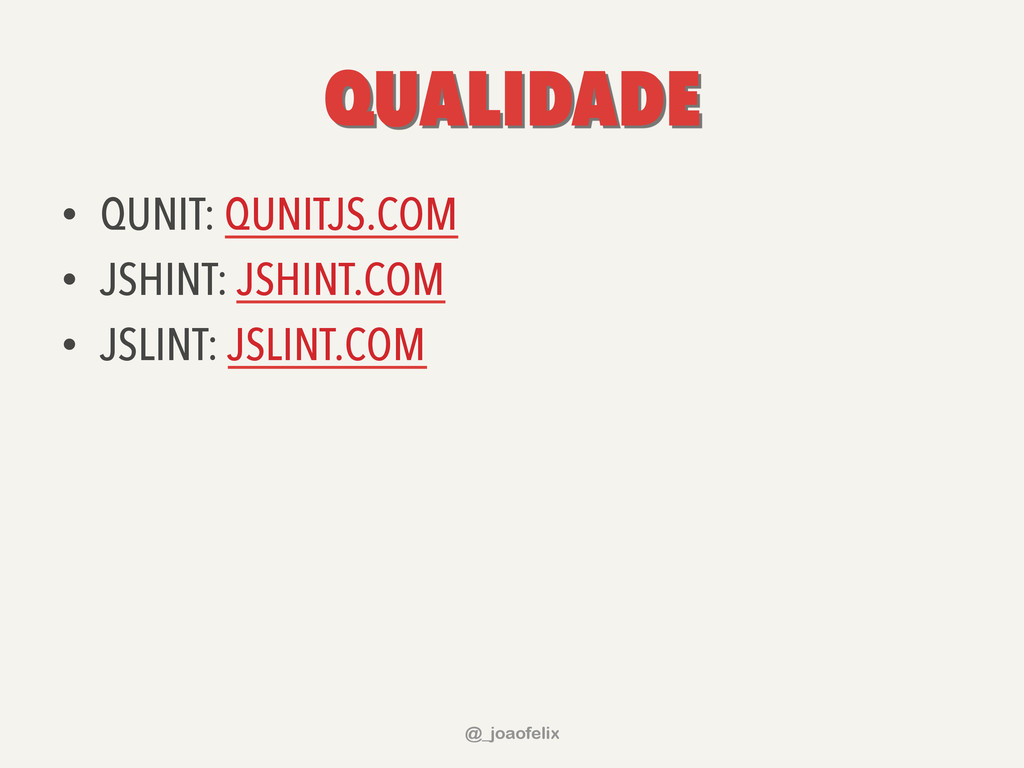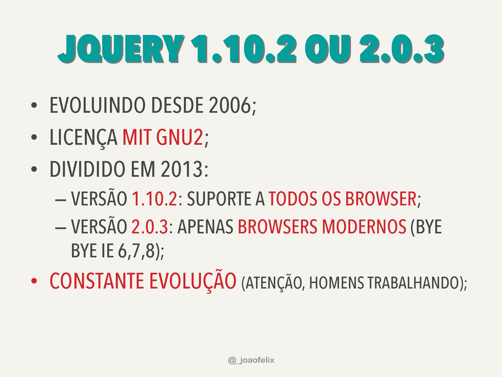 EM 2013: – VERSÃO 1.10.2: SUPORTE A TODOS OS BROWSER; – VERSÃO 2.0.3: APENAS BROWSERS MODERNOS (BYE BYE IE 6,7,8); • CONSTANTE EVOLUÇÃO (ATENÇÃO, HOMENS TRABALHANDO); @_joaofelix