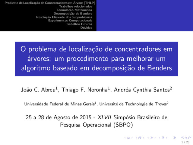 (THLP) Trabalhos relacionados Formula¸ c˜ ao Matem´ atica Decomposi¸ c˜ ao de Benders Resolu¸ c˜ ao Eficiente dos Subproblemas Experimentos Computacionais Trabalhos Futuros D´ uvidas Resultados Preliminares Benders de Sa et. al. Benders+ p α Gap(%) #Iter SP(s) SP/#Iter Gap(%) #Iter SP(s) SP/#Iter % speedup 3 0,2 0,00 1 579,38 579,38 0,00 1 411,97 411,97 28,89 3 0,5 0,00 2 1173,55 586,78 0,00 2 850,64 425,32 27,52 3 0,8 0,00 2 1173,45 586,72 0,00 2 846,16 423,08 27,89 5 0,2 0,00 2 1173,33 586,66 0,00 2 847,93 423,96 27,73 5 0,5 0,00 2 1187,93 593,97 0,00 2 897,95 448,98 24,41 5 0,8 0,02 2 1163,19 581,59 0,03 2 835,47 417,73 28,17 8 0,2 0,08 7 4116,52 588,07 0,11 7 2943,11 420,44 28,51 8 0,5 0,01 2 1166,66 583,33 0,04 2 832,98 416,49 28,60 8 0,8 5,23 1 580,22 580,22 5,23 1 408,92 408,92 29,52 Table : Compara¸ c˜ ao entre Benders de Sa et. al. e Benders+ em instˆ ancias AP de 50 n´ os. 26 / 28