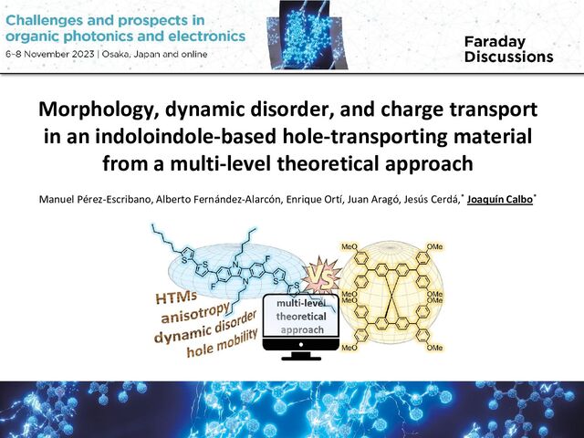 groups → solution processability Hole transporting materials (HTMs) Organic HTMs • biodegradable • processability • low cost p-type semiconductor PCE > 21% µ ca. 10−3 cm2 V−1 s−1 π-π stacking dynamic disorder mesoscale ordering µ, PCE, stability indolo-indole unit:
