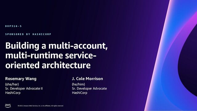 rights reserved. © 2023, Amazon Web Services, Inc. or its affiliates. All rights reserved. © 2023, Amazon Web Services, Inc. or its affiliates. All rights reserved. © 2023, Amazon Web Services, Inc. or its affiliates. All rights reserved. S P O N S O R E D B Y H A S H I C O R P Building a multi-account, multi-runtime service- oriented architecture Rosemary Wang D O P 3 1 6 - S (she/her) Sr. Developer Advocate II HashiCorp J. Cole Morrison (he/him) Sr. Developer Advocate HashiCorp
