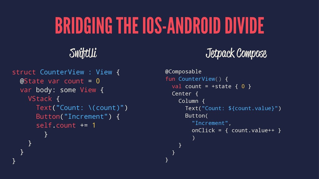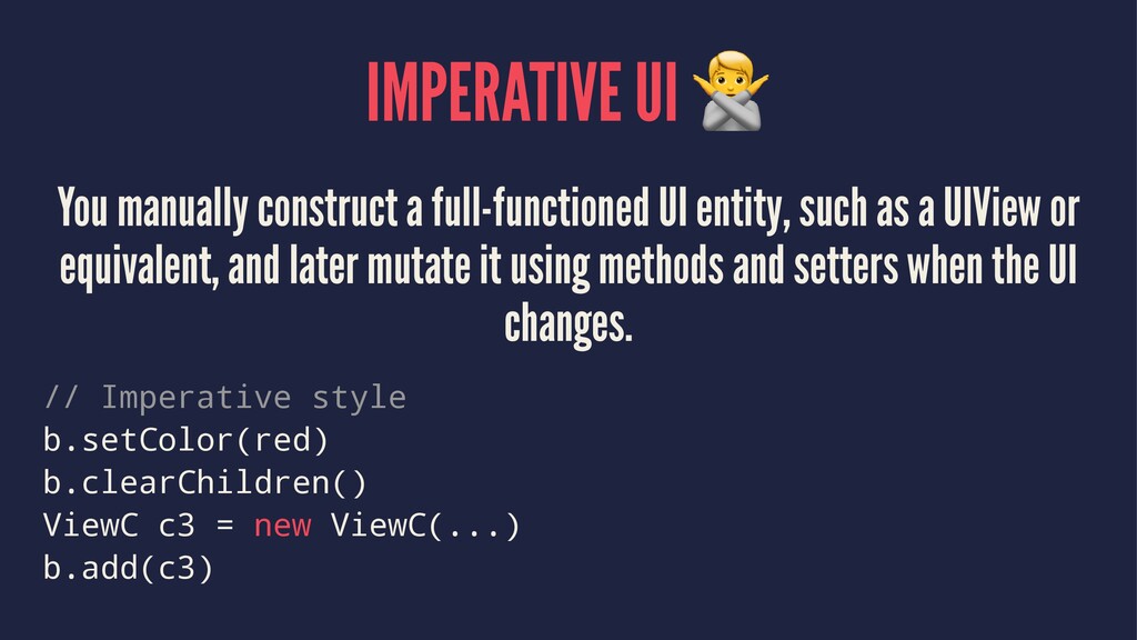 as a UIView or equivalent, and later mutate it using methods and setters when the UI changes. // Imperative style b.setColor(red) b.clearChildren() ViewC c3 = new ViewC(...) b.add(c3)