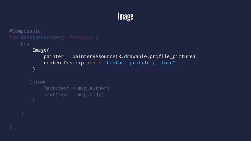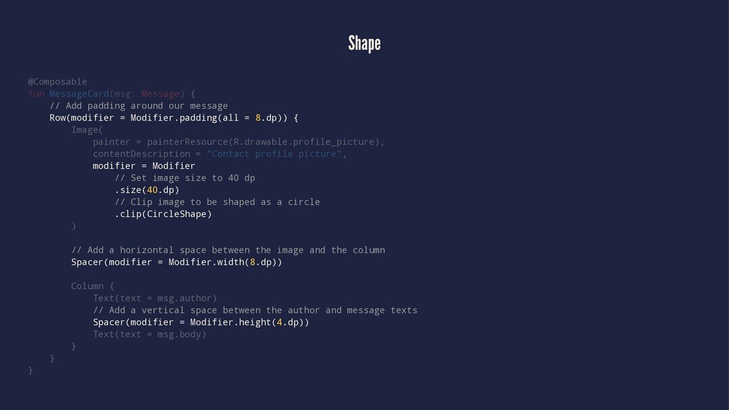 our message Row(modifier = Modifier.padding(all = 8.dp)) { Image( painter = painterResource(R.drawable.profile_picture), contentDescription = "Contact profile picture", modifier = Modifier // Set image size to 40 dp .size(40.dp) // Clip image to be shaped as a circle .clip(CircleShape) ) // Add a horizontal space between the image and the column Spacer(modifier = Modifier.width(8.dp)) Column { Text(text = msg.author) // Add a vertical space between the author and message texts Spacer(modifier = Modifier.height(4.dp)) Text(text = msg.body) } } }