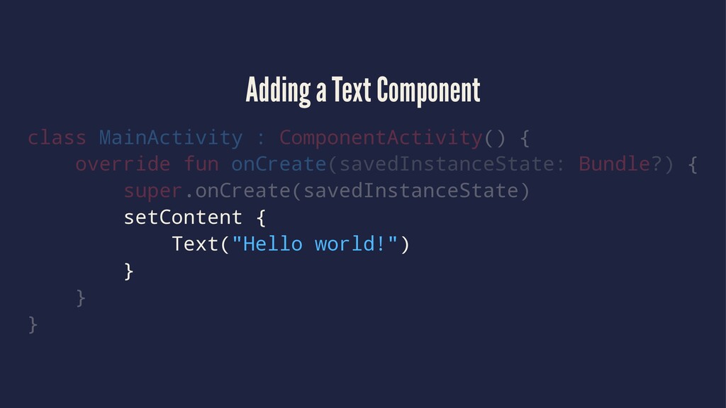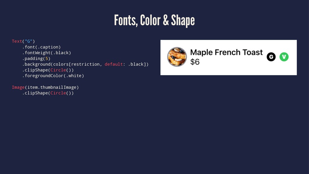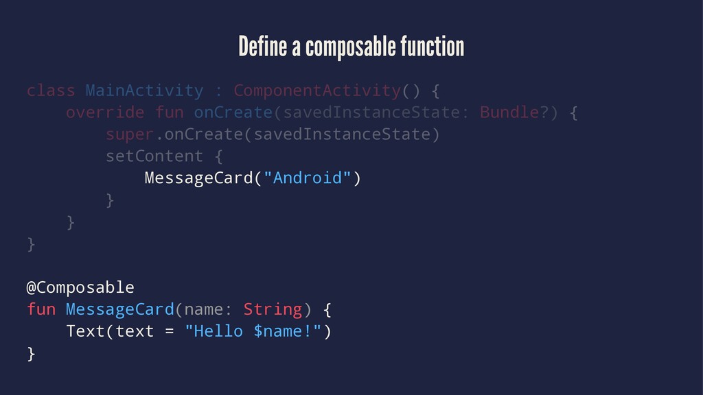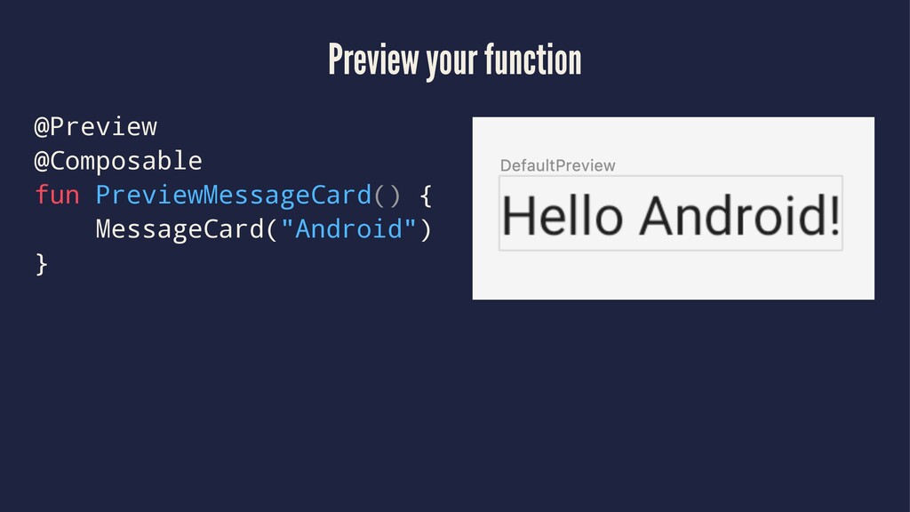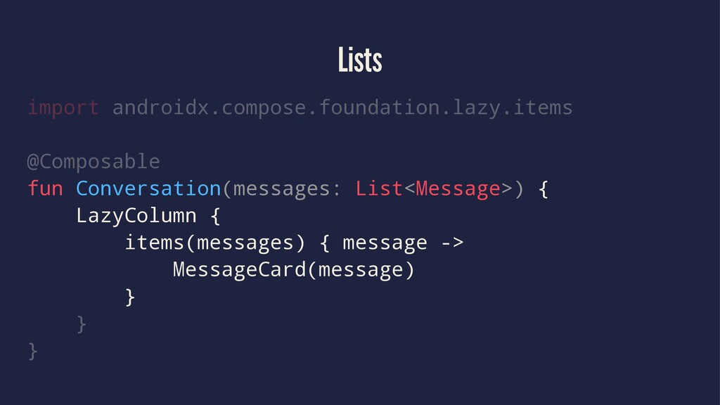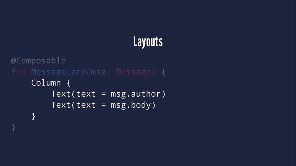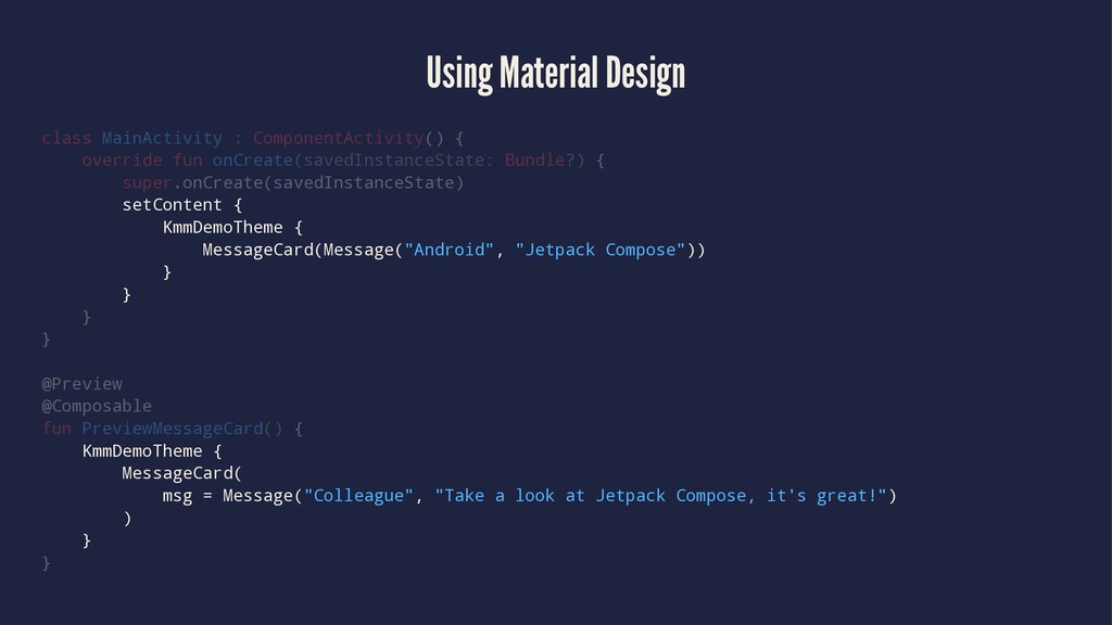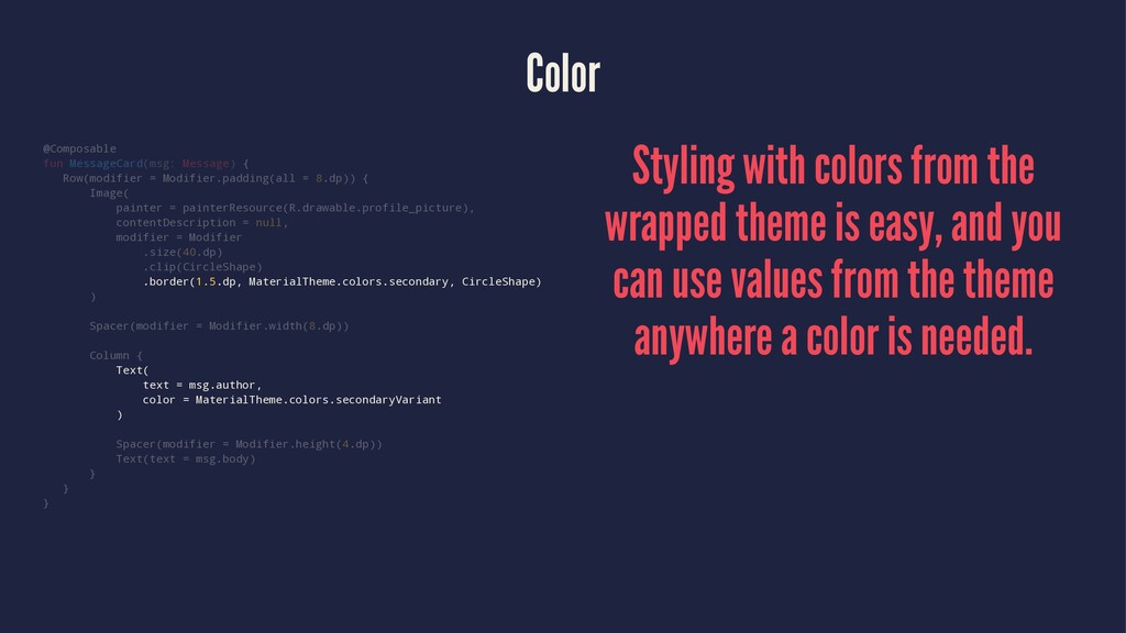 8.dp)) { Image( painter = painterResource(R.drawable.profile_picture), contentDescription = null, modifier = Modifier .size(40.dp) .clip(CircleShape) .border(1.5.dp, MaterialTheme.colors.secondary, CircleShape) ) Spacer(modifier = Modifier.width(8.dp)) Column { Text( text = msg.author, color = MaterialTheme.colors.secondaryVariant ) Spacer(modifier = Modifier.height(4.dp)) Text(text = msg.body) } } } Styling with colors from the wrapped theme is easy, and you can use values from the theme anywhere a color is needed.