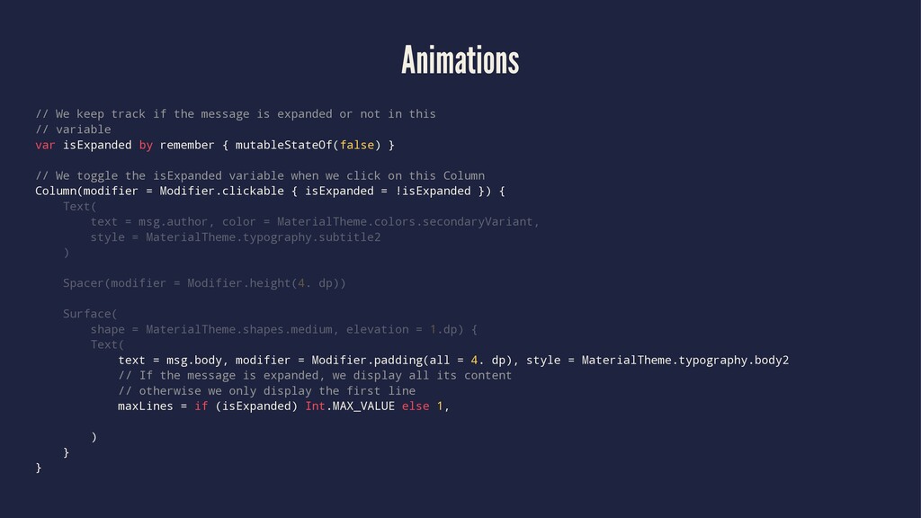 or not in this // variable var isExpanded by remember { mutableStateOf(false) } // We toggle the isExpanded variable when we click on this Column Column(modifier = Modifier.clickable { isExpanded = !isExpanded }) { Text( text = msg.author, color = MaterialTheme.colors.secondaryVariant, style = MaterialTheme.typography.subtitle2 ) Spacer(modifier = Modifier.height(4. dp)) Surface( shape = MaterialTheme.shapes.medium, elevation = 1.dp) { Text( text = msg.body, modifier = Modifier.padding(all = 4. dp), style = MaterialTheme.typography.body2 // If the message is expanded, we display all its content // otherwise we only display the first line maxLines = if (isExpanded) Int.MAX_VALUE else 1, ) } }