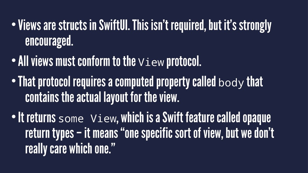 strongly encouraged. •All views must conform to the View protocol. •That protocol requires a computed property called body that contains the actual layout for the view. •It returns some View, which is a Swift feature called opaque return types – it means “one specific sort of view, but we don’t really care which one.”
