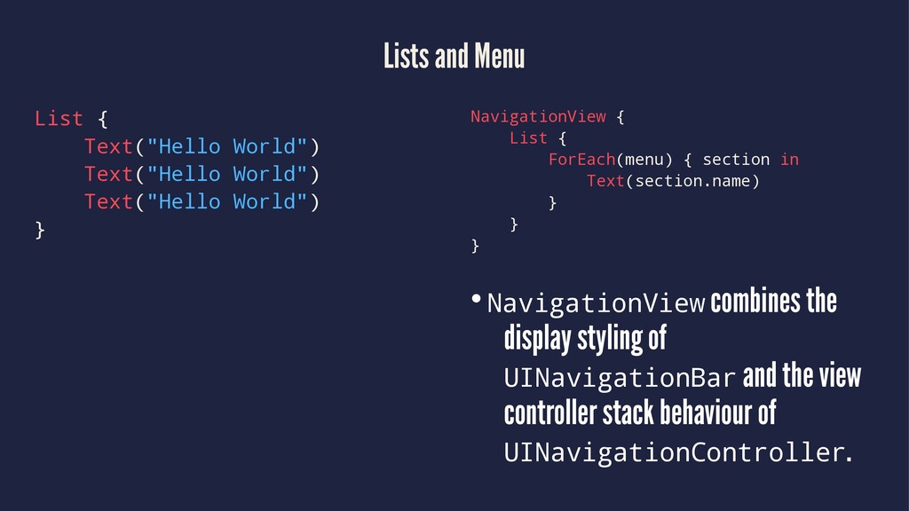 World") } NavigationView { List { ForEach(menu) { section in Text(section.name) } } } •NavigationView combines the display styling of UINavigationBar and the view controller stack behaviour of UINavigationController.