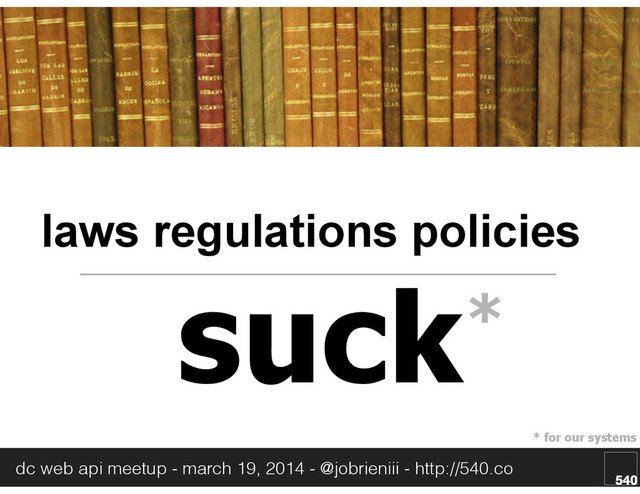 web api meetup - march 19, 2014 - @jobrieniii - http://540.co https://speakerdeck.com/jobrieniii/government-policy-apis another API slide deck that talks different integration strategies github repo where we plan to release code https://github.com/540co/fedapi-policyapi [email protected] contact info 407.718.0732
