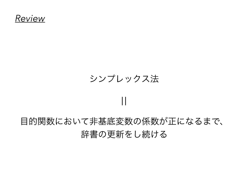 Simplex Method Cycling ࠷ॳʹѻͬͨγϯϓϨοΫε๏ͰɺجఈʹೖΔ ͔Βग़Δ มͷબͼํΛ࠷ऴنଇͱ͍͏ɻ ͜ͷͱ͖ࣙॻΛߋ৽ͯ͠८ճ͢ΔՄೳੑ͕͋Δɻ ͜ΕΛ͙ͨΊʹɺجఈʹೖΔมͷબͼํͰɺ ࠷খఴ͑ࣈنଇΛ͏ɻ ८ճɿ