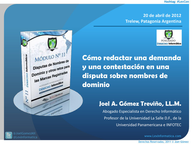 Cómo redactar una demanda y una contestación en una disputa sobre nombres de dominio Joel A. Gómez Treviño, LL.M. Abogado Especialista en Derecho Informático Profesor de la Universidad La Salle D.F., de la Universidad Panamericana e INFOTEC 20 de abril de 2012 Trelew, Patagonia Argentina www.LexInformatica.com 1