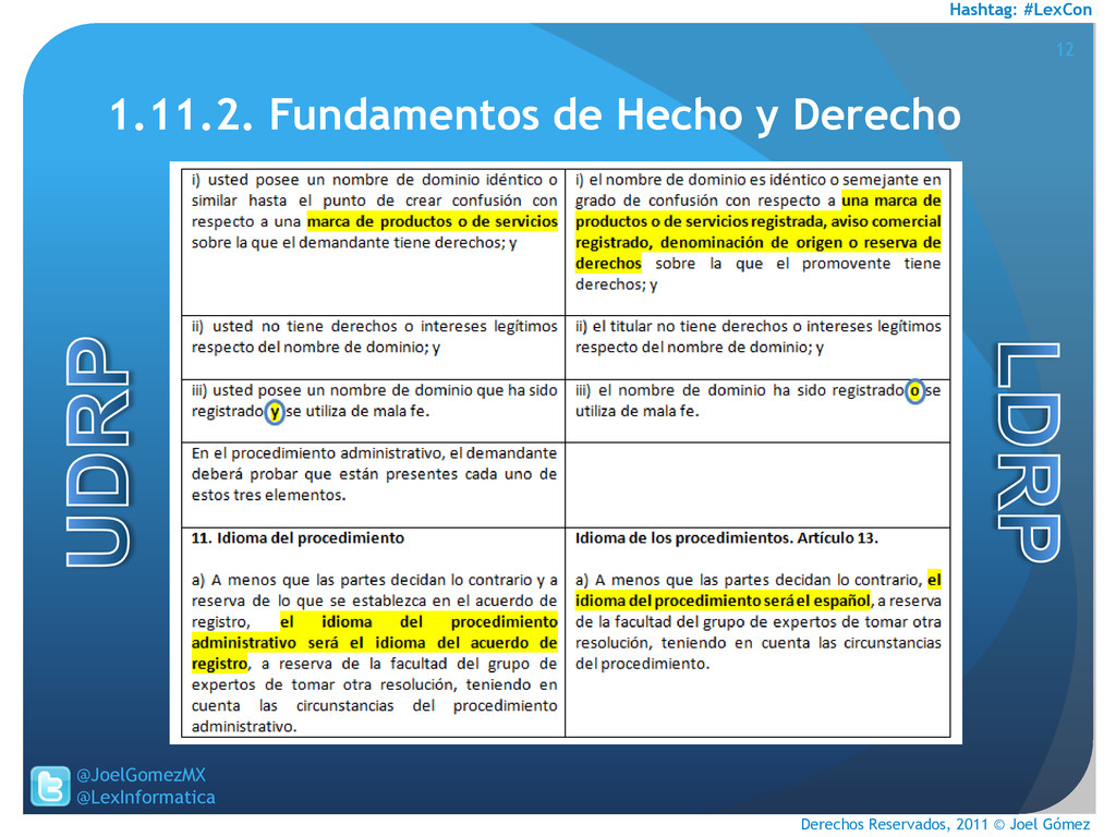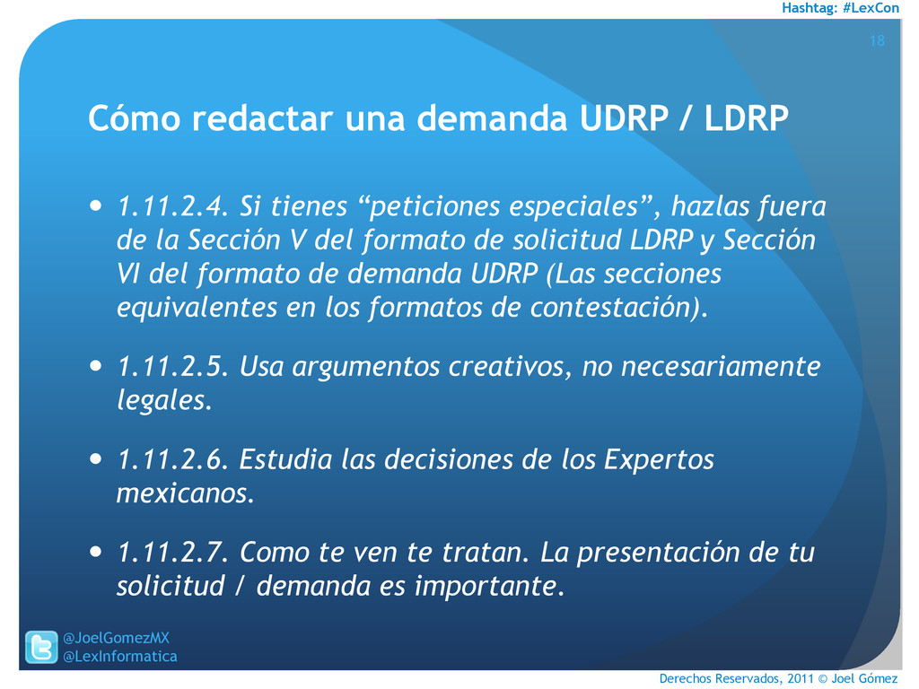 Cómo redactar una demanda UDRP / LDRP 1.10. Evalúa y planea la estrategia de tu demanda UDRP / solicitud LDRP.mx. Recuerda que como demandante tienes una gran ventaja y dos importantes desventajas: Tienes todo el tiempo del mundo para planear y redactar tu solicitud o demanda. Solo tienes una oportunidad para presentar tus argumentos (no hay etapa de alegatos). No sabes qué va a contestar el demandado, procura anticipar sus argumentos. Tienes que probar los 3 o 4 elementos que marca la Política LDRP o UDRP. 9
