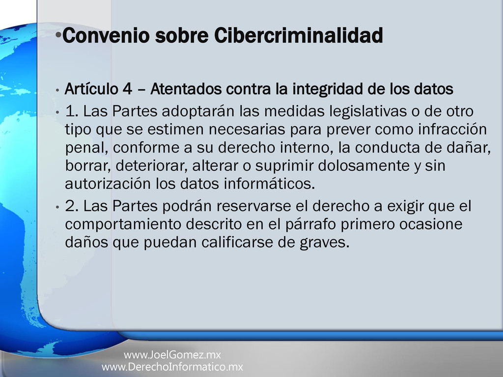 Convenio de la Ciberdelincuencia (Convenio de Budapest, vigente en 32 países) • Artículo 5 (1) – Ataques a la integridad del sistema. Cada Parte adoptará las medidas legislativas y de otro tipo que resulten necesarias para tipificar como delito en su derecho interno la obstaculización grave, deliberada e ilegítima del funcionamiento de un sistema informático mediante la introducción, transmisión, daño, borrado, deterioro, alteración o supresión de datos informáticos. @JoelGomezMX @LexInformatica