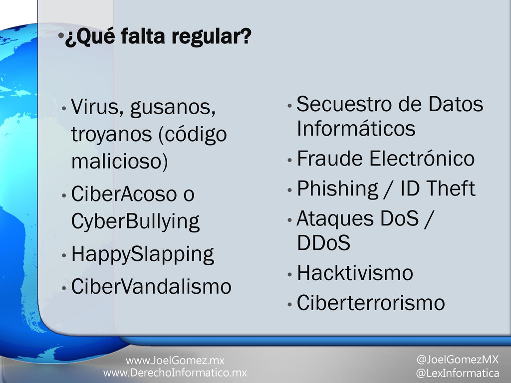 identidad • Aprovechamiento de datos personales para hacerse pasar por otra persona, con el objeto de obtener beneficios económicos o cometer delitos. • CiberAcoso • Acosar, hostigar, molestar, intimidar o amenazar personas o entidades usando medios informáticos. • Falsificaciones y fraudes electrónicos • Virus, gusanos y códigos malignos @JoelGomezMX @LexInformatica