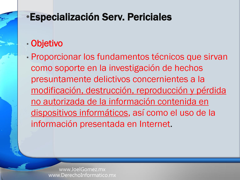 un ataque, usted deberá tener la capacidad y los elementos para que el Perito de la PGR: • Auxilie al Ministerio Público de la Federación, en la búsqueda, preservación y obtención de indicios y pruebas tendientes a la acreditación de los elementos del tipo penal en la probable responsabilidad de una persona en un ilícito. • Proporcione los fundamentos técnicos que sirvan como soporte en la investigación de hechos presuntamente delictivos concernientes a la modificación, destrucción, reproducción y pérdida no autorizada de la información contenida en dispositivos informáticos.