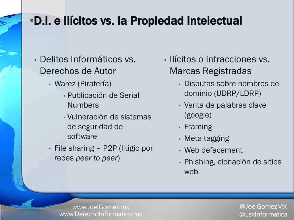 Delitos Informáticos vs. Derechos de Autor • Warez (Piratería) • Publicación de Serial Numbers • Vulneración de sistemas de seguridad de software • File sharing – P2P (litigio por redes peer to peer) • Ilícitos o infracciones vs. Marcas Registradas • Disputas sobre nombres de dominio (UDRP/LDRP) • Venta de palabras clave (google) • Framing • Meta-tagging • Web defacement • Phishing, clonación de sitios web @JoelGomezMX @LexInformatica