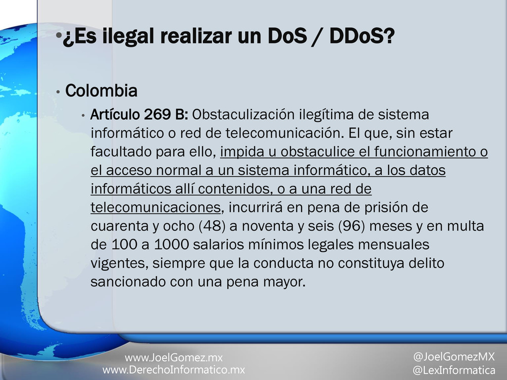 Colombia • Artículo 269 B: Obstaculización ilegítima de sistema informático o red de telecomunicación. El que, sin estar facultado para ello, impida u obstaculice el funcionamiento o el acceso normal a un sistema informático, a los datos informáticos allí contenidos, o a una red de telecomunicaciones, incurrirá en pena de prisión de cuarenta y ocho (48) a noventa y seis (96) meses y en multa de 100 a 1000 salarios mínimos legales mensuales vigentes, siempre que la conducta no constituya delito sancionado con una pena mayor. @JoelGomezMX @LexInformatica