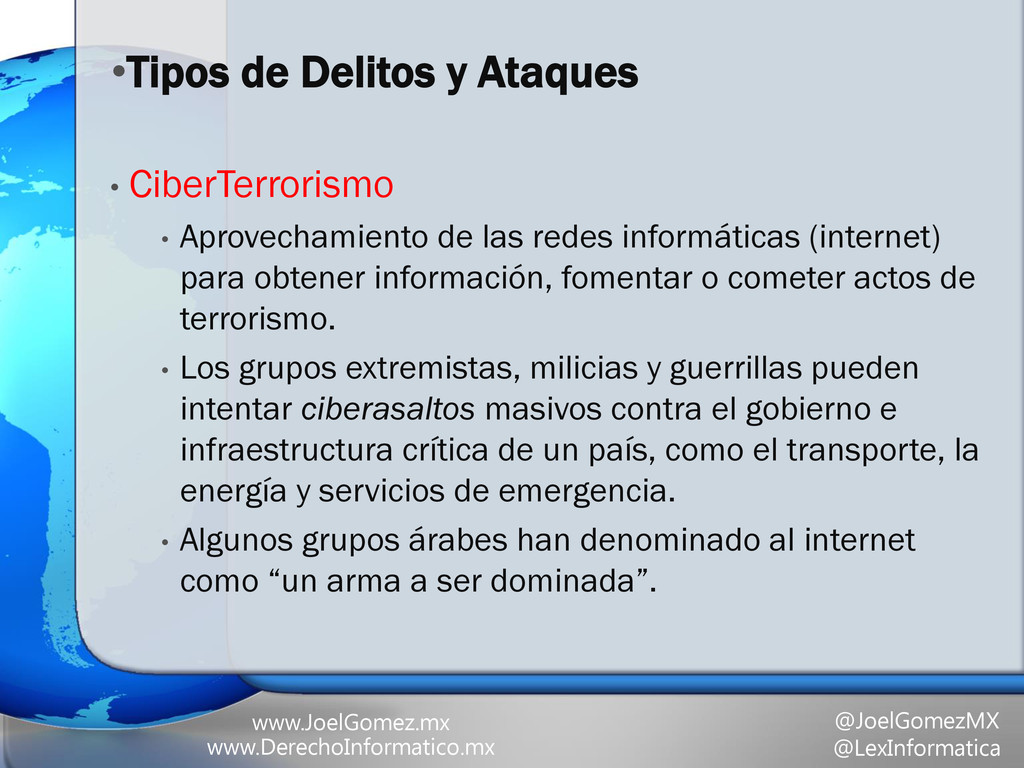 Aprovechamiento de las redes informáticas (internet) para obtener información, fomentar o cometer actos de terrorismo. • Los grupos extremistas, milicias y guerrillas pueden intentar ciberasaltos masivos contra el gobierno e infraestructura crítica de un país, como el transporte, la energía y servicios de emergencia. • Algunos grupos árabes han denominado al internet como “un arma a ser dominada”. @JoelGomezMX @LexInformatica