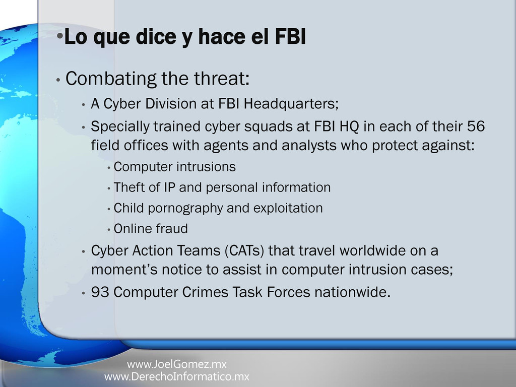 Combating the threat: • A Cyber Division at FBI Headquarters; • Specially trained cyber squads at FBI HQ in each of their 56 field offices with agents and analysts who protect against: • Computer intrusions • Theft of IP and personal information • Child pornography and exploitation • Online fraud • Cyber Action Teams (CATs) that travel worldwide on a moment’s notice to assist in computer intrusion cases; • 93 Computer Crimes Task Forces nationwide.
