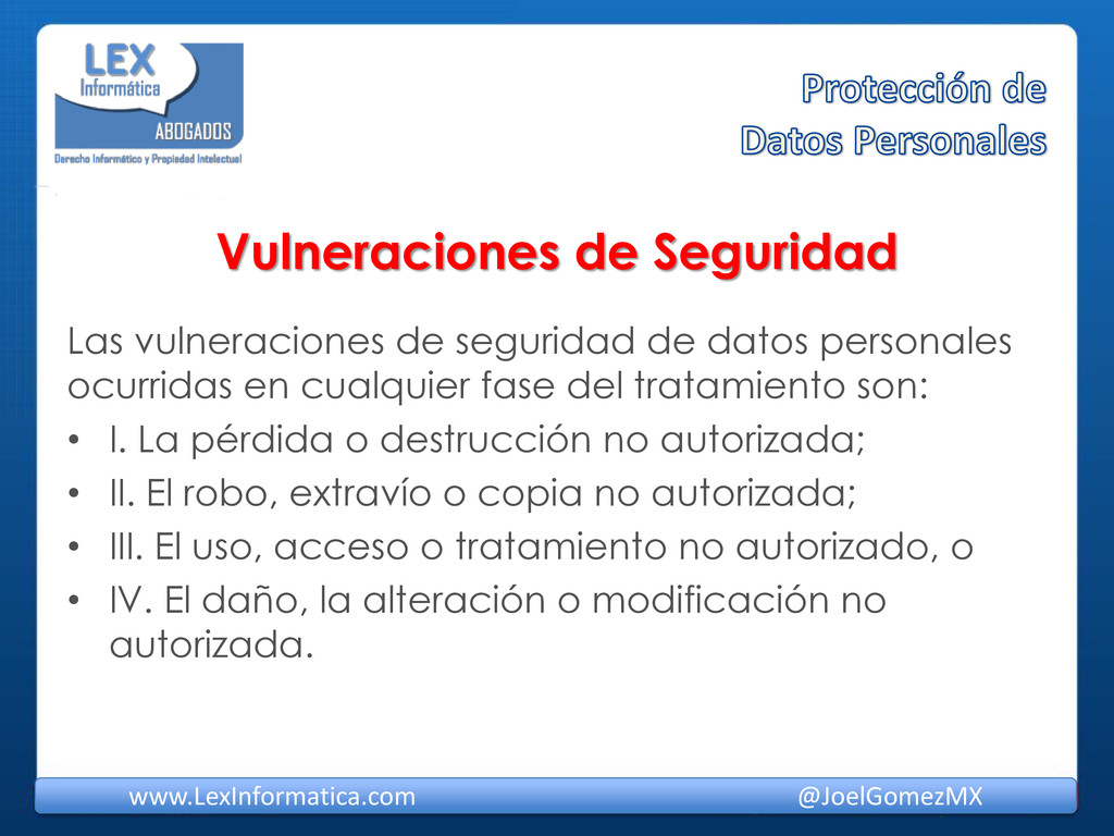 datos personales ocurridas en cualquier fase del tratamiento son: • I. La pérdida o destrucción no autorizada; • II. El robo, extravío o copia no autorizada; • III. El uso, acceso o tratamiento no autorizado, o • IV. El daño, la alteración o modificación no autorizada.