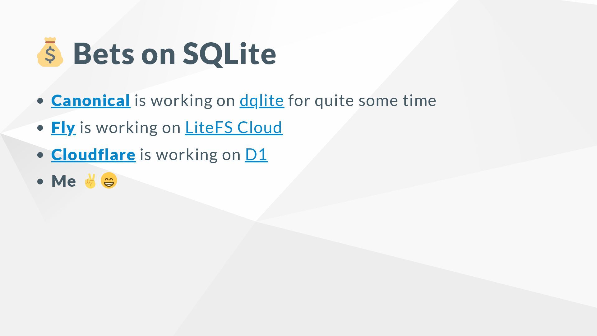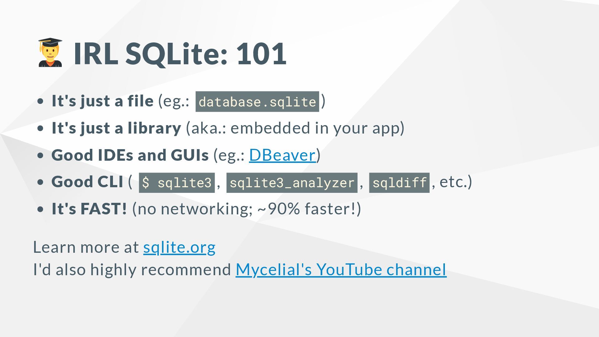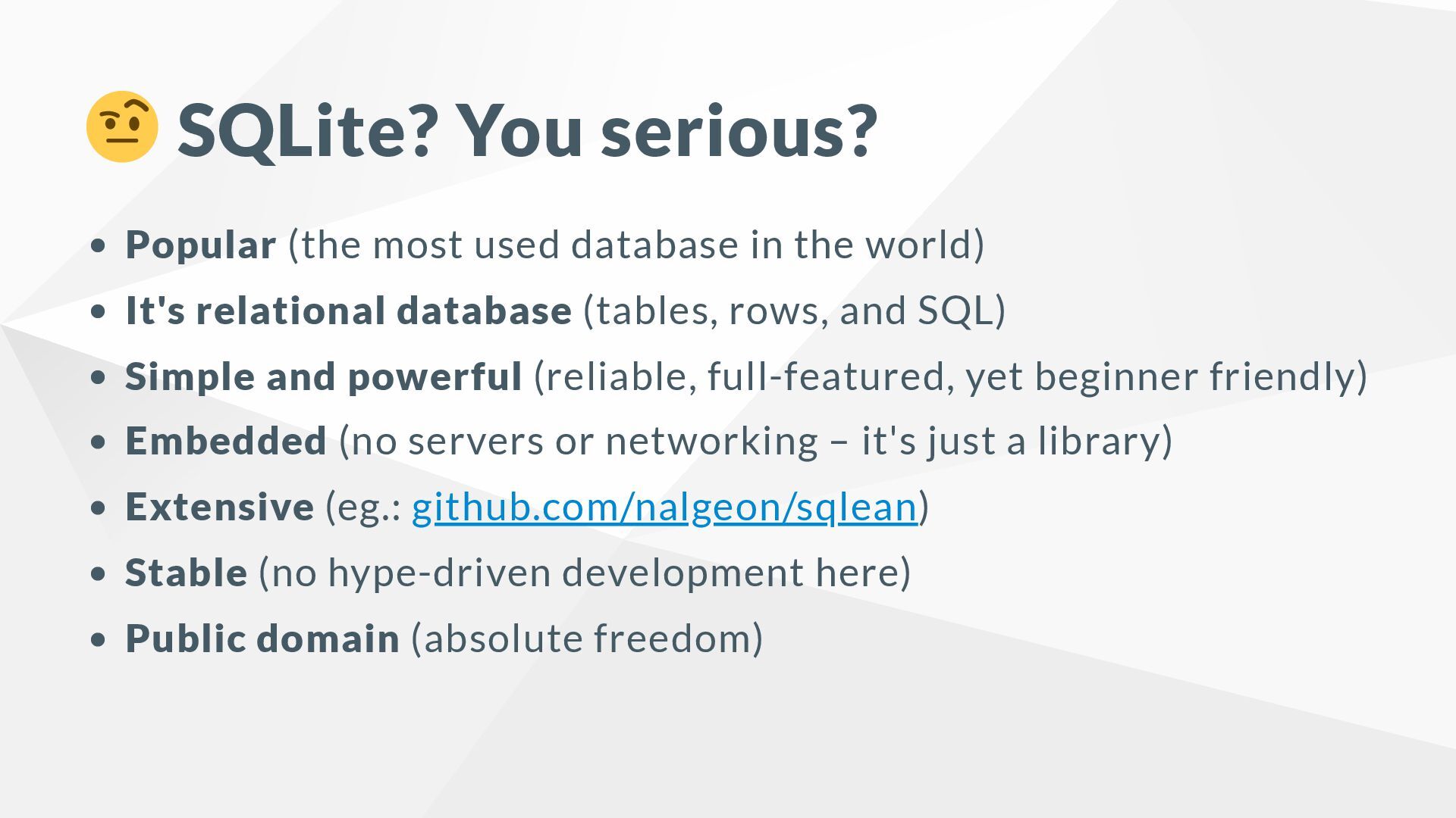 world) It's relational database (tables, rows, and SQL) Simple and powerful (reliable, full-featured, yet beginner friendly) Embedded (no servers or networking – it's just a library) Extensive (eg.: github.com/nalgeon/sqlean) Stable (no hype-driven development here) Public domain (absolute freedom)