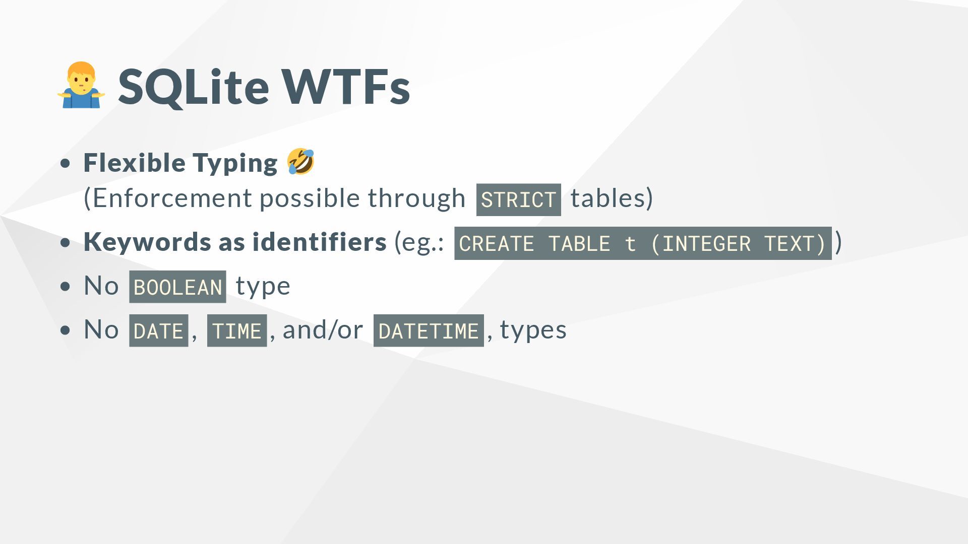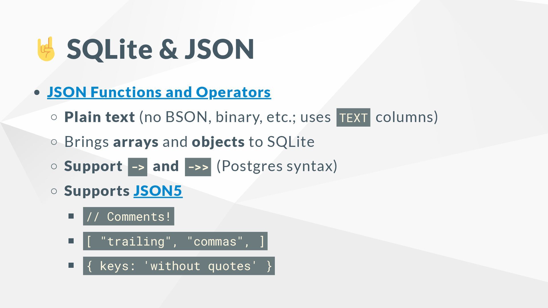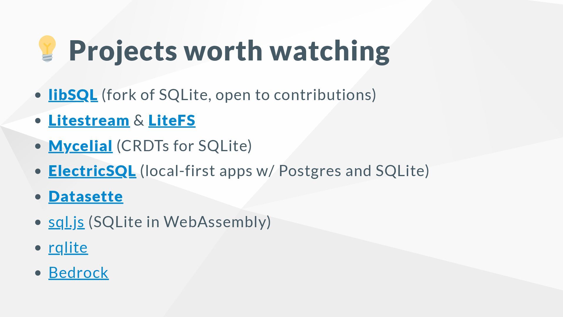 world) It's relational database (tables, rows, and SQL) Simple and powerful (reliable, full-featured, yet beginner friendly) Embedded (no servers or networking – it's just a library) Extensive (eg.: github.com/nalgeon/sqlean) Stable (no hype-driven development here) Public domain (absolute freedom)