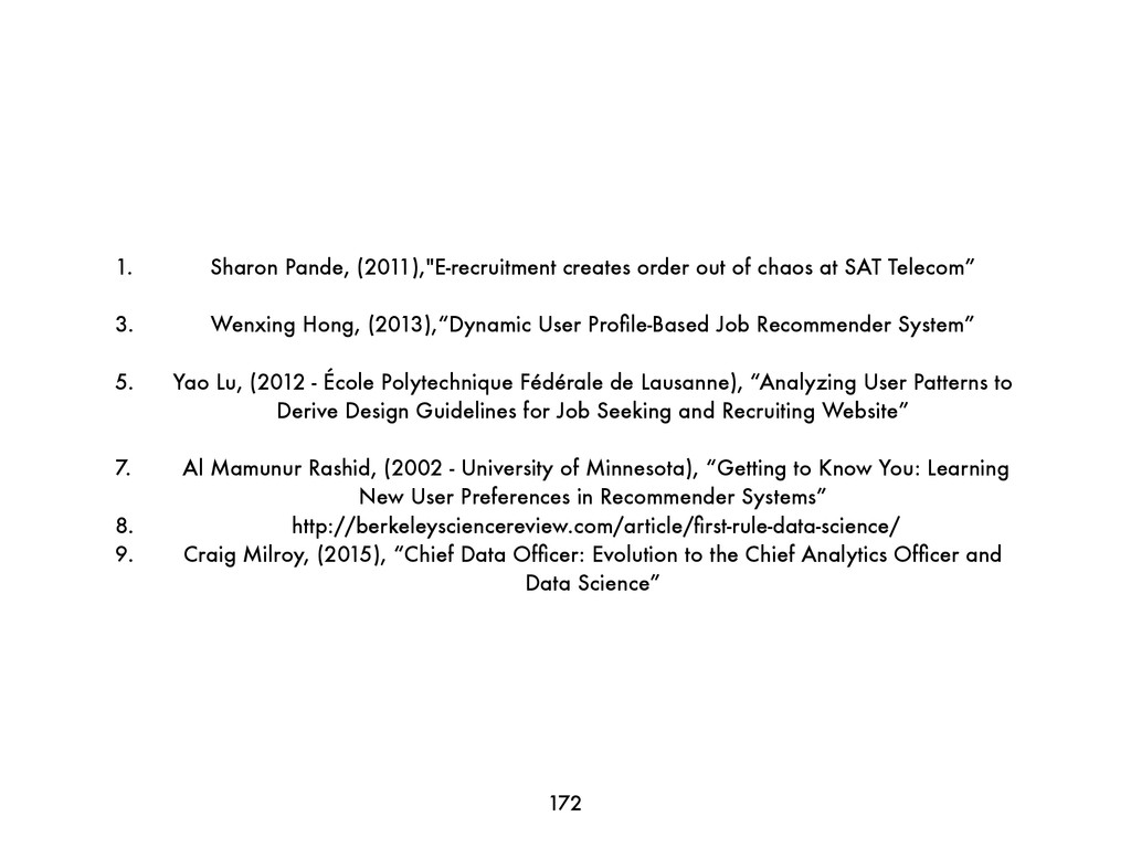 SAT Telecom” 3. Wenxing Hong, (2013),“Dynamic User Profile-Based Job Recommender System” 5. Yao Lu, (2012 - École Polytechnique Fédérale de Lausanne), “Analyzing User Patterns to Derive Design Guidelines for Job Seeking and Recruiting Website” 7. Al Mamunur Rashid, (2002 - University of Minnesota), “Getting to Know You: Learning New User Preferences in Recommender Systems” 8. http://berkeleysciencereview.com/article/first-rule-data-science/ 9. Craig Milroy, (2015), “Chief Data Officer: Evolution to the Chief Analytics Officer and Data Science” 172