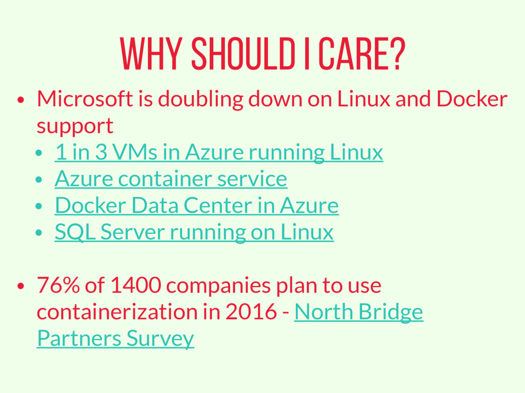 Linux and Docker support • 1 in 3 VMs in Azure running Linux • Azure container service • Docker Data Center in Azure • SQL Server running on Linux • 76% of 1400 companies plan to use containerization in 2016 - North Bridge Partners Survey