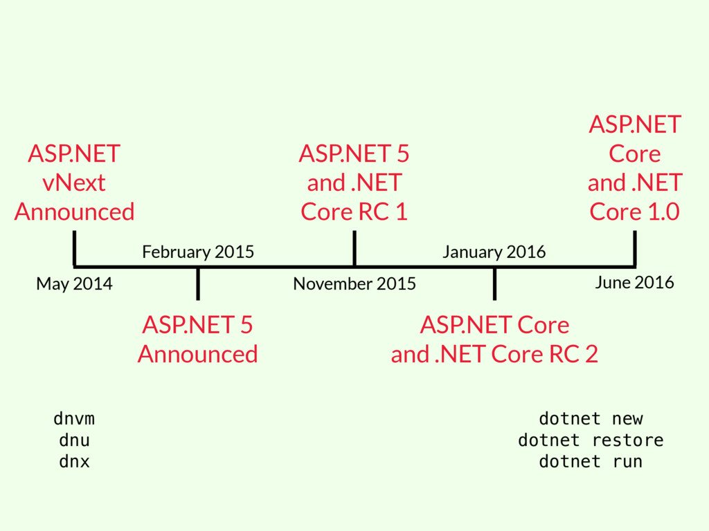 Core RC 1 ASP.NET Core and .NET Core RC 2 ASP.NET Core and .NET Core 1.0 May 2014 February 2015 November 2015 January 2016 June 2016 dnvm dnu dnx dotnet new dotnet restore dotnet run