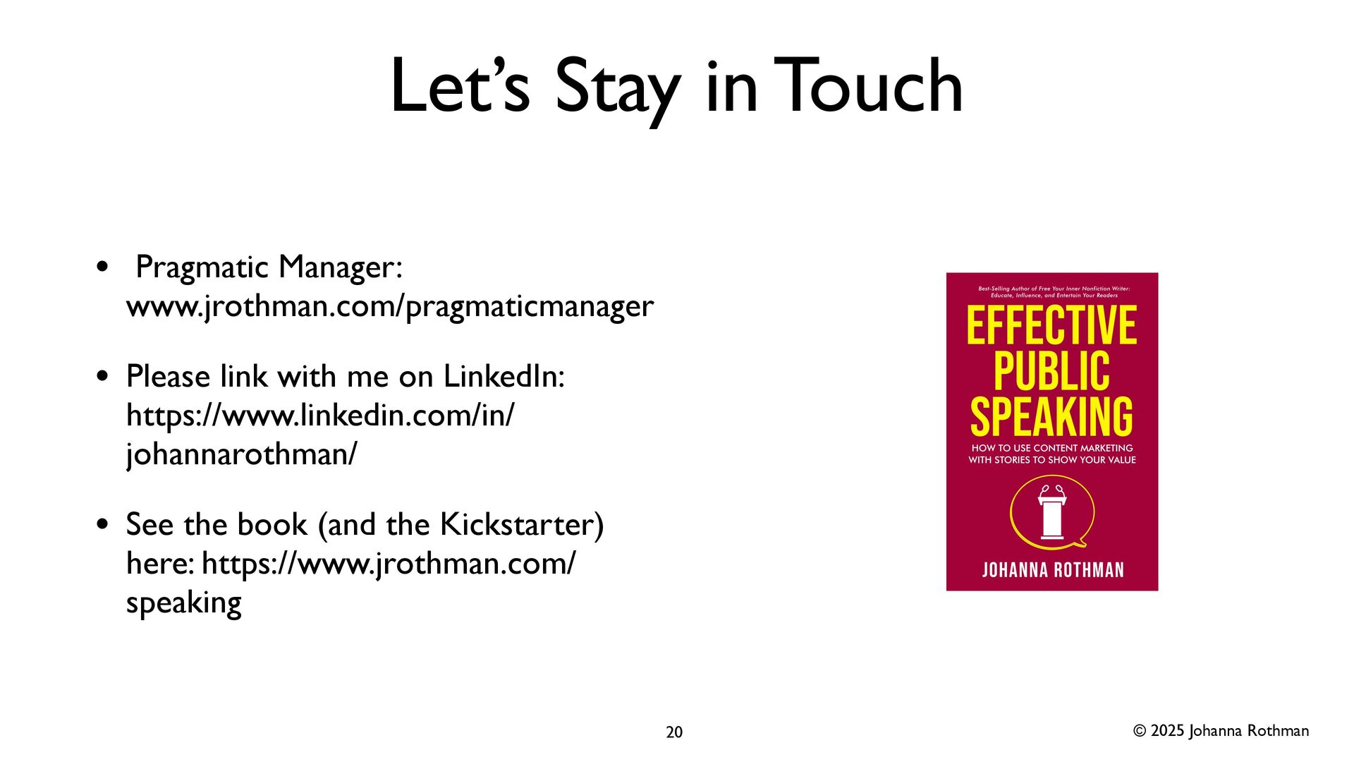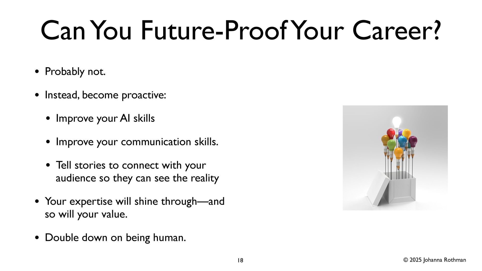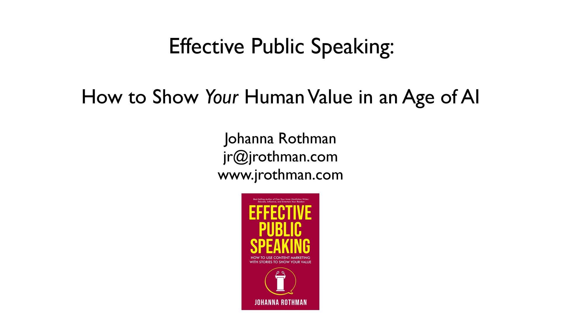 As a consultant, I’ve spoken professionally since 1997, all to show my expertise and value. Now, in 2025—and beyond—we all need to show our value to all kinds of managers. Not just hiring managers, but managers who think they can reduce headcount because of AI. Those managers do not realize AI can be a helpful tool, but only humans can create great products customers will buy.
