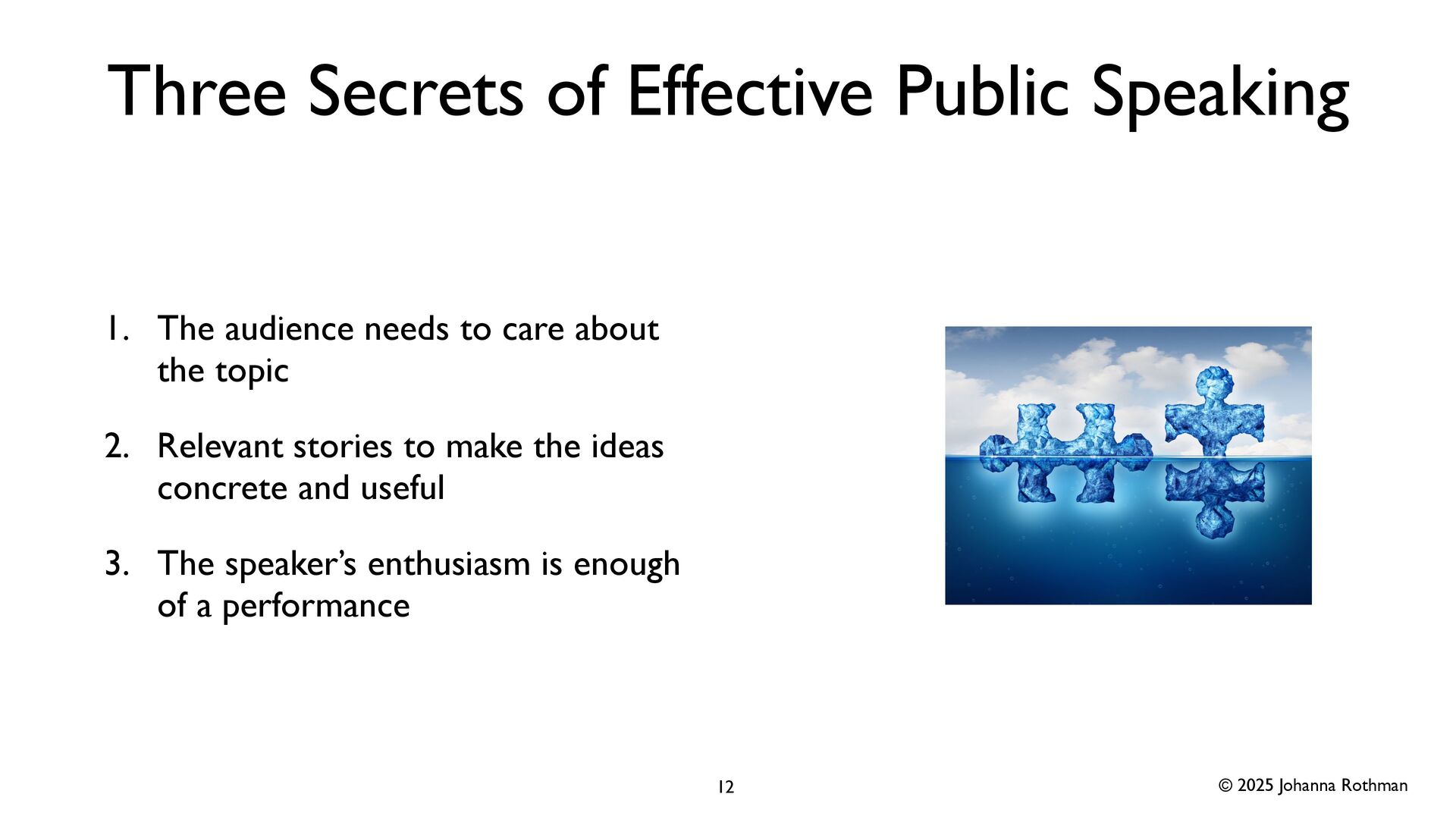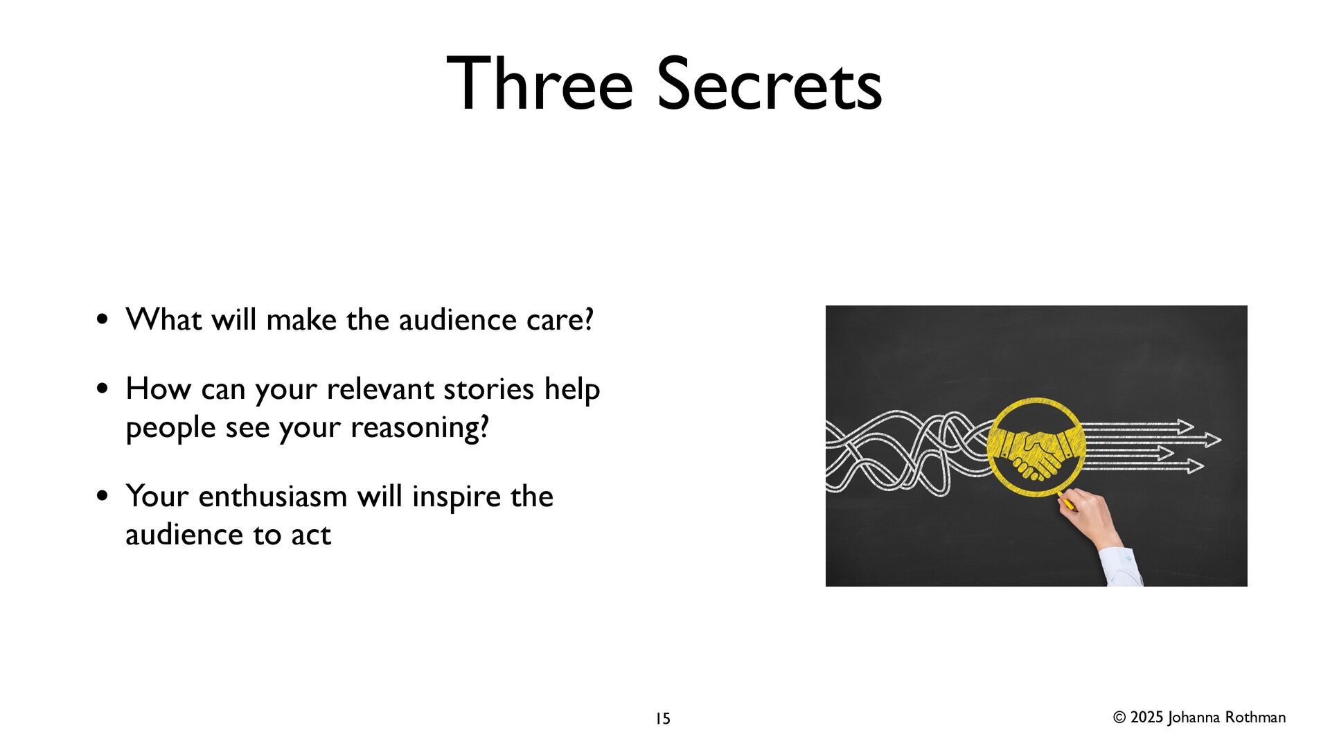 I’ve put together this presentation so you can apply these ideas to help you see your expertise. The three secrets of effective speaking are: