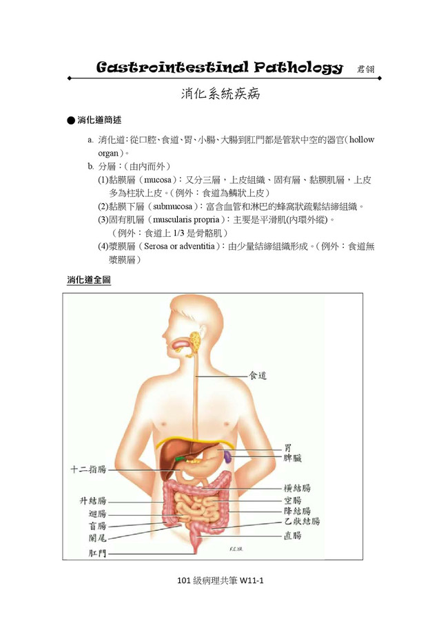 可單獨發生,但往往合併於其他胃病,如胃潰瘍、胃癌。 萎縮性胃炎 胃黏膜萎縮使分泌胃液功能變差,造成消 化不良 增生性胃炎(hyperplastic gastritis) 胃黏膜變的肥厚且一團一團的,像鵝卵石 一樣 c. 致病原因: 環境(environmental)因素: (1) 胃幽門桿菌(H. Pylori gastritis, HP) I. 飲食 II. 抽煙 III. 酗酒 IV. 分泌過剩 (hypersecretory) : 屬於增生性胃病 (hyperplastic gastropathy) (2) Zollinger‐Ellison syndrome:由於腫瘤而分泌過多的胃泌素,使得 I. 胃酸分泌過多。 Menetrier’s disease(講義打錯字) II. Hypertrophic hypersecertory gastropathy III. 自體免疫(autoimmune) :自體免疫慢性胃炎(autoimmune chronic (3) gastritis)抗體攻擊胃腺細胞 胃幽門螺旋桿菌(H. Pylori gastritis, HP) 胃幽門螺旋桿菌(H. Pylori gastritis, HP) 1. 作用機制:HP 位在黏液層深處,HP 分泌的酵素和毒素會跟宿主分泌的胃酸 及蛋白分解酵素作用,造成胃黏膜的慢性傷害,產生慢性胃炎。 2. 治療時要消滅 HP,故會合併使用抗生素。 3. HP 會產生尿素,臨床上可以用做檢驗的指標。 幽門螺旋桿菌有關的疾病 慢性胃炎(chronic gastritis) 強烈相關 消化性潰瘍疾病(peptic ulcer disease) 強烈相關 胃癌(gastric carcinoma) 病源學上的假說 胃淋巴癌(gastric lymphoma) 病源學上的假說