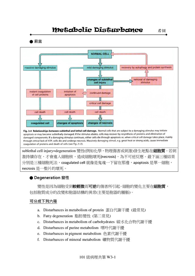 pigment: melanin, hemoglobin-related pigment, lipofusin 內源性色素:黑色素、血紅素相關色素、脂褐素 老師提到口腔有白色念珠菌感染,就會有白色的病變 c. Exogenous pigment: tattoo, anthracosis, silicosis 外源性色素:刺青、碳末沉著症、矽肺病 類型 定義 好發點/舉例 病理性色素沉積 (pathologic pigmentation) 細胞內外等 物質的聚積 血鐵素(hemosiderin):主要見於肝、脾、淋巴 結、骨髓等器官 黑色素(melanin):腎上腺功能低下時所造成 addison disease 脂褐素(lipofuscin):老年人中的肝細胞的細胞 質中 膽紅素(bilirubin):在膽道阻塞及某些肝疾病時 101 級病理共筆 W3-22