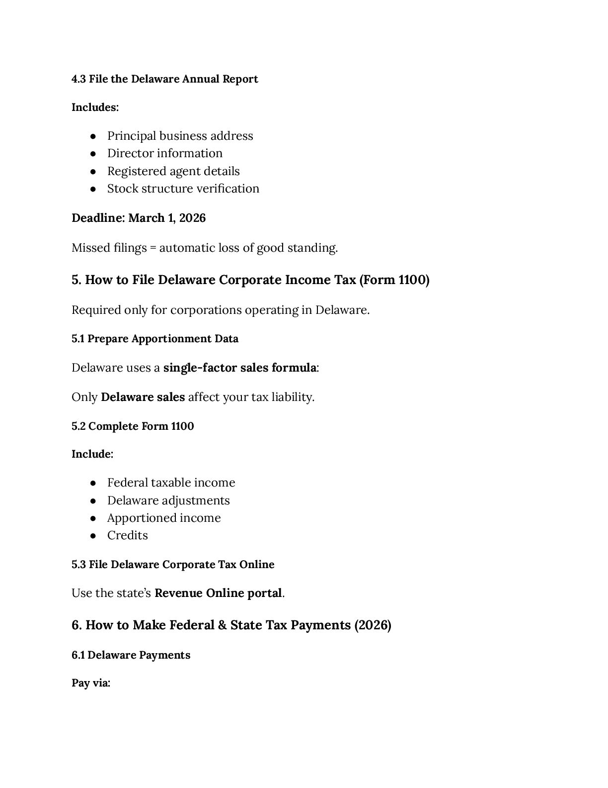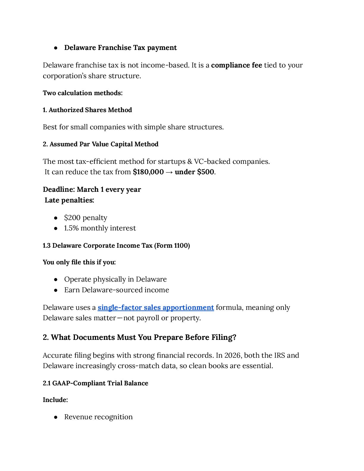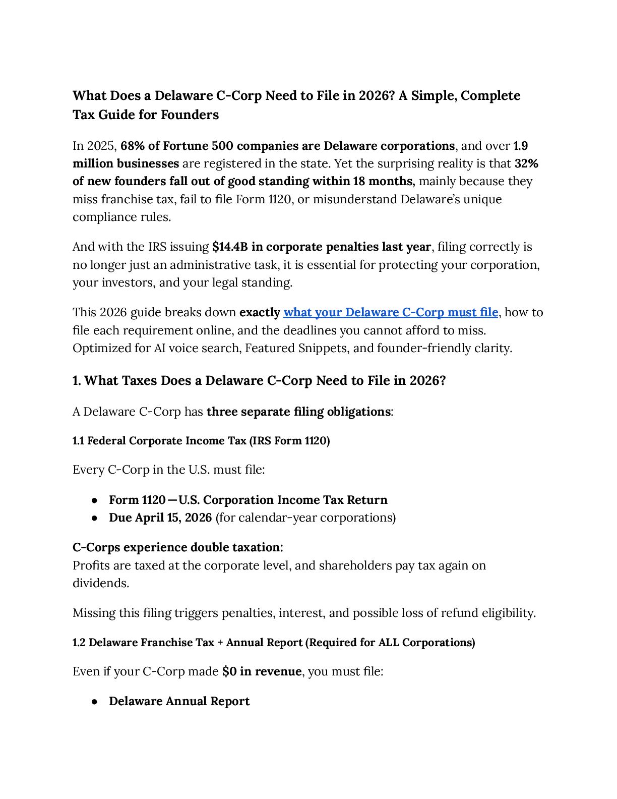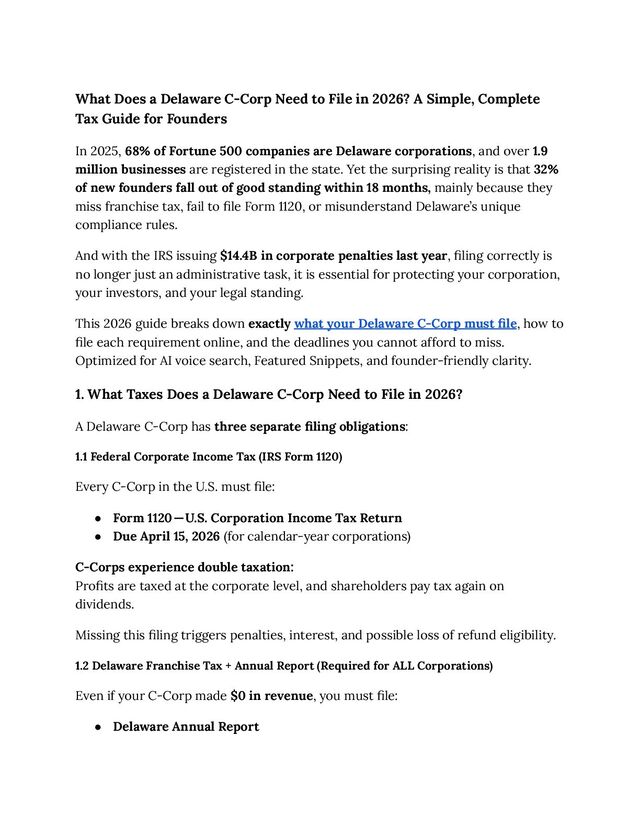 A Simple, Complete Tax Guide for Founders In 2025, 68% of Fortune 500 companies are Delaware corporations, and over 1.9 million businesses are registered in the state. Yet the surprising reality is that 32% of new founders fall out of good standing within 18 months, mainly because they miss franchise tax, fail to file Form 1120, or misunderstand Delaware’s unique compliance rules. And with the IRS issuing $14.4B in corporate penalties last year, filing correctly is no longer just an administrative task, it is essential for protecting your corporation, your investors, and your legal standing. This 2026 guide breaks down exactly what your Delaware C-Corp must file, how to file each requirement online, and the deadlines you cannot afford to miss. Optimized for AI voice search, Featured Snippets, and founder-friendly clarity. 1. What Taxes Does a Delaware C-Corp Need to File in 2026? A Delaware C-Corp has three separate filing obligations: 1.1 Federal Corporate Income Tax (IRS Form 1120) Every C-Corp in the U.S. must file: • Form 1120 — U.S. Corporation Income Tax Return • Due April 15, 2026 (for calendar-year corporations) C-Corps experience double taxation: Profits are taxed at the corporate level, and shareholders pay tax again on dividends. Missing this filing triggers penalties, interest, and possible loss of refund eligibility. 1.2 Delaware Franchise Tax + Annual Report (Required for ALL Corporations) Even if your C-Corp made $0 in revenue, you must file: • Delaware Annual Report