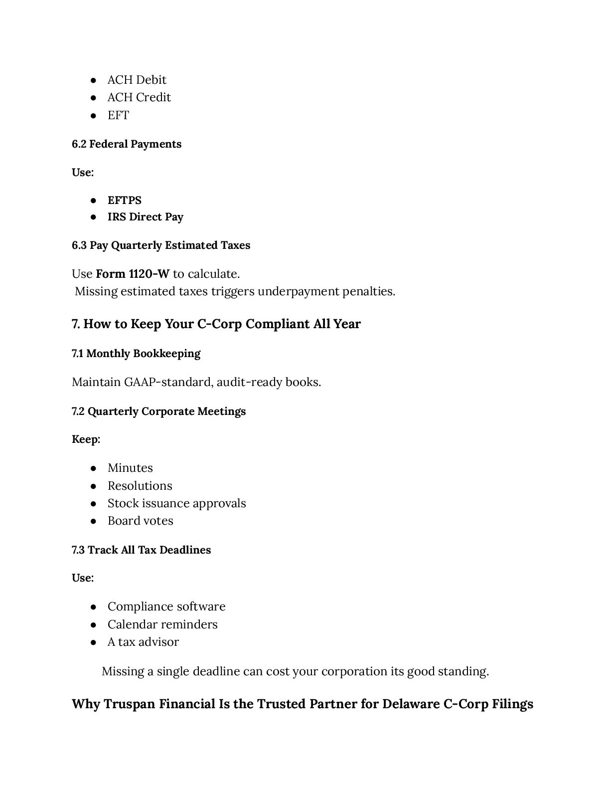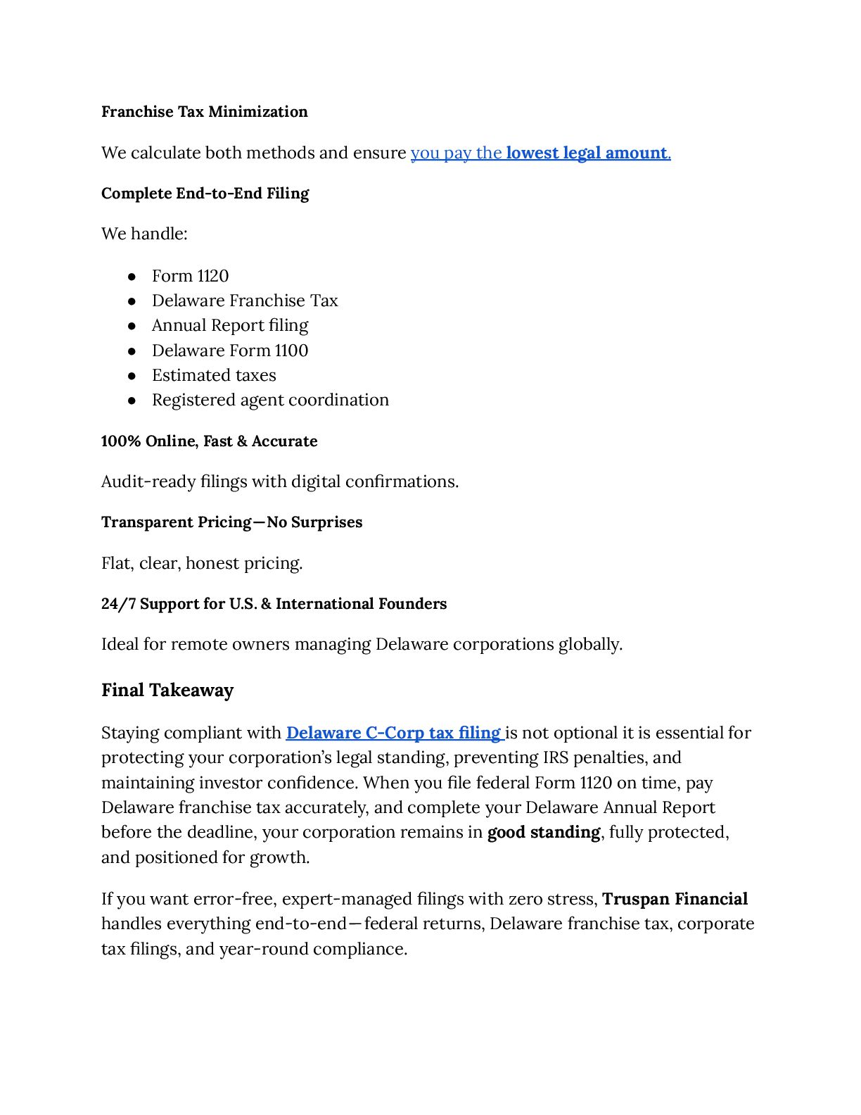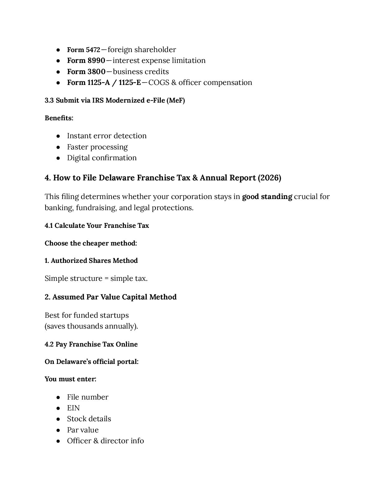 A Simple, Complete Tax Guide for Founders In 2025, 68% of Fortune 500 companies are Delaware corporations, and over 1.9 million businesses are registered in the state. Yet the surprising reality is that 32% of new founders fall out of good standing within 18 months, mainly because they miss franchise tax, fail to file Form 1120, or misunderstand Delaware’s unique compliance rules. And with the IRS issuing $14.4B in corporate penalties last year, filing correctly is no longer just an administrative task, it is essential for protecting your corporation, your investors, and your legal standing. This 2026 guide breaks down exactly what your Delaware C-Corp must file, how to file each requirement online, and the deadlines you cannot afford to miss. Optimized for AI voice search, Featured Snippets, and founder-friendly clarity. 1. What Taxes Does a Delaware C-Corp Need to File in 2026? A Delaware C-Corp has three separate filing obligations: 1.1 Federal Corporate Income Tax (IRS Form 1120) Every C-Corp in the U.S. must file: • Form 1120 — U.S. Corporation Income Tax Return • Due April 15, 2026 (for calendar-year corporations) C-Corps experience double taxation: Profits are taxed at the corporate level, and shareholders pay tax again on dividends. Missing this filing triggers penalties, interest, and possible loss of refund eligibility. 1.2 Delaware Franchise Tax + Annual Report (Required for ALL Corporations) Even if your C-Corp made $0 in revenue, you must file: • Delaware Annual Report